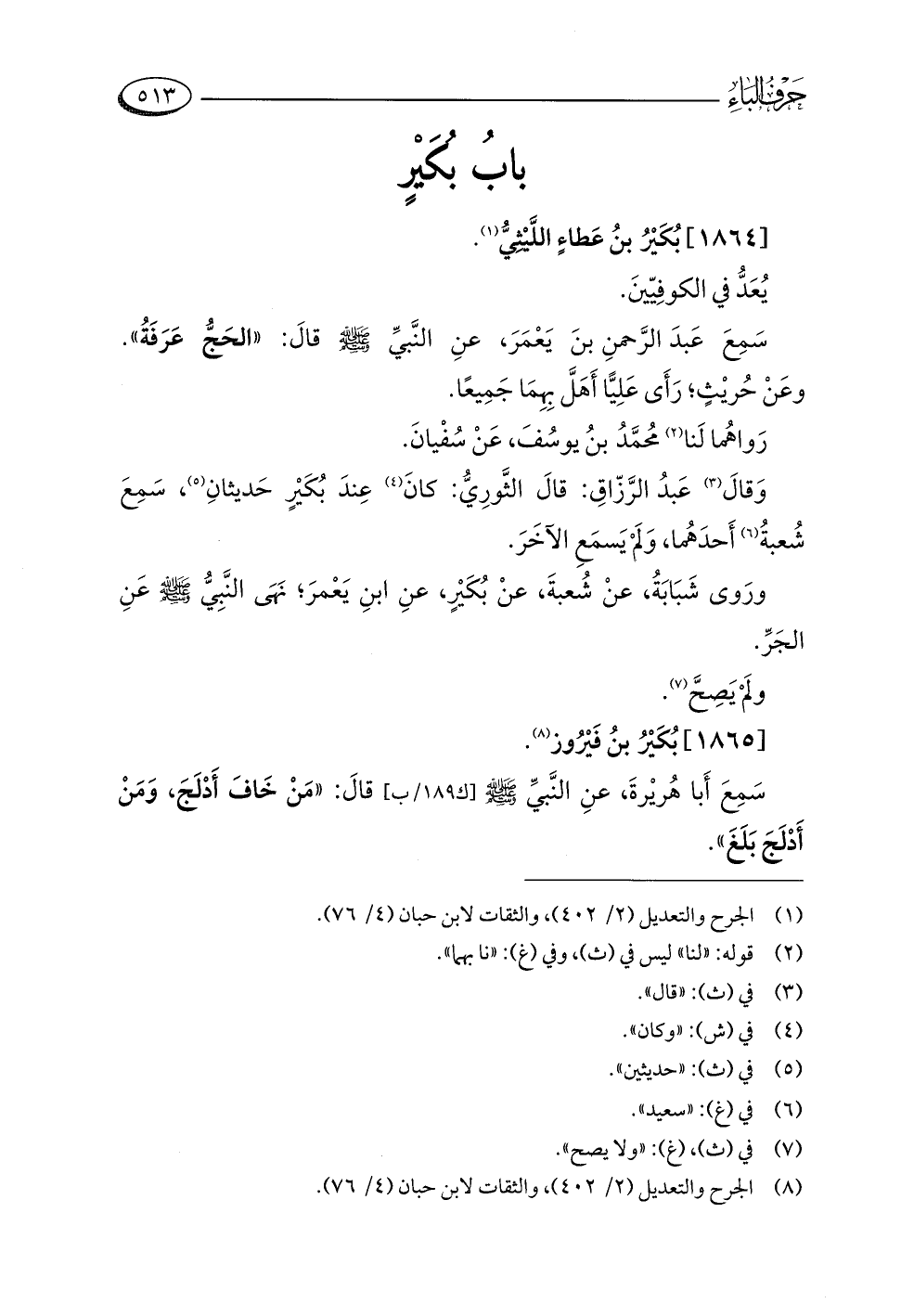 سَمِعَ عَبدَ الرَّحمنِ بنَ يَعْمَرَ، عنِ النَّبيِّ -صلى اللَّه عليه وسلم- قالَ: "الحَجُّ عَرَفَةُ". وعَنْ حُريْثٍ؛ رَأَى عَلِيًّا أَهَلَّ بِهِمَا جَمِيعًا.