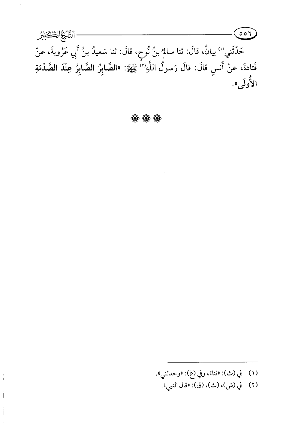 حَدّثَني (¬١) بيانٌ، قَالَ: ثنا سالمُ بنُ نُوحٍ، قَالَ: ثنا سَعيدُ بنُ أَبِي عَرُوبةَ، عنْ قَتادةَ، عنْ أَنسٍ قَالَ: قَالَ رَسولُ اللَّهِ (¬٢) -صلى اللَّه عليه وسلم-: "الصَّابِرُ الصَّابِرُ عِنْدَ الصَّدْمَةِ الأُولَى".