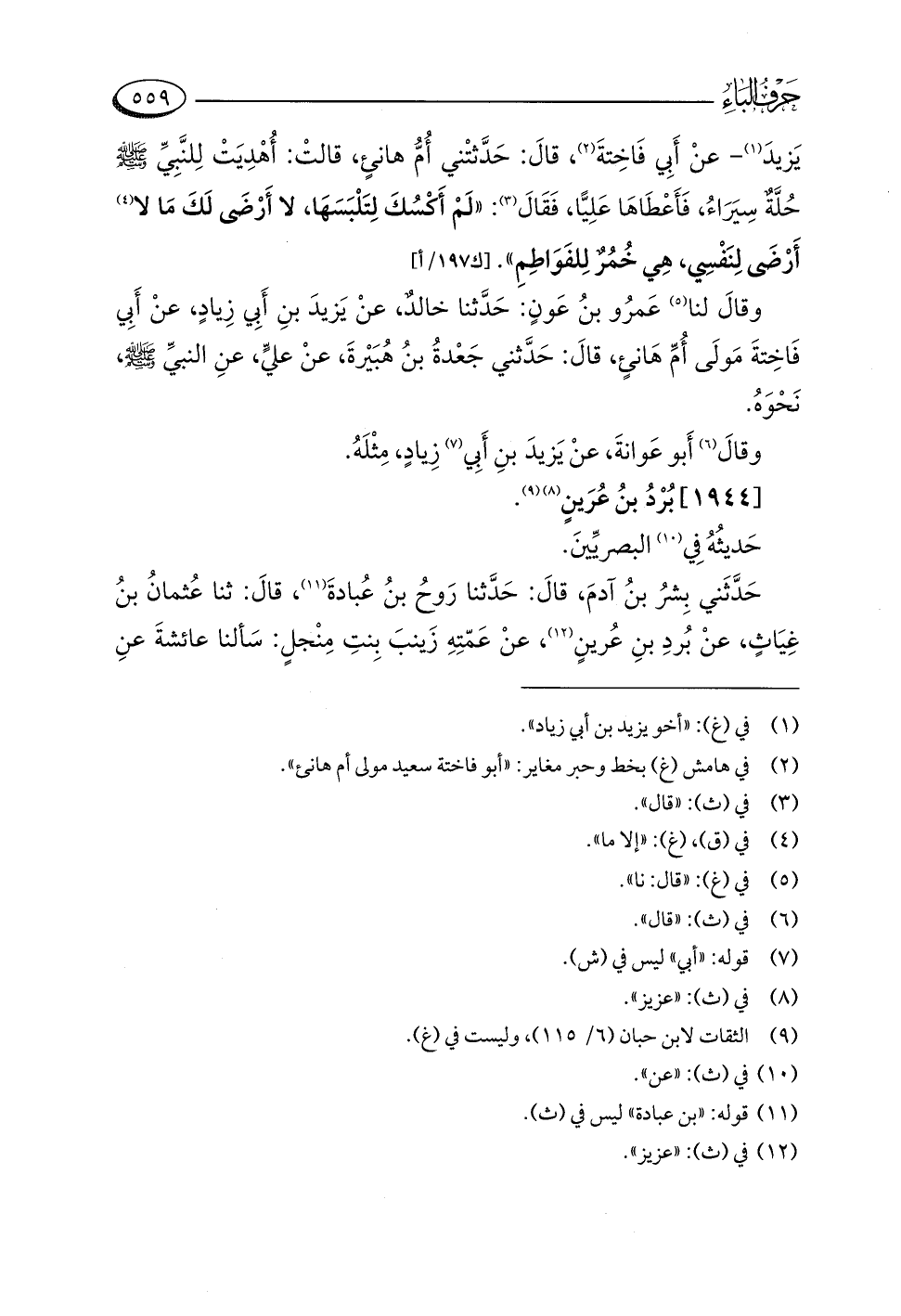 وقالَ لنا (¬٥) عَمرُو بنُ عَونٍ: حَدَّثنا خالدٌ، عنْ يَزيدَ بنِ أَبِي زِيادٍ، عنْ أَبِي فَاخِتةَ مَولَى أُمِّ هَانئٍ، قَالَ: حَدَّثني جَعْدةُ بنُ هُبَيْرةَ، عنْ عليٍّ، عنِ النبيِّ -صلى اللَّه عليه وسلم-، نَحْوَهُ.