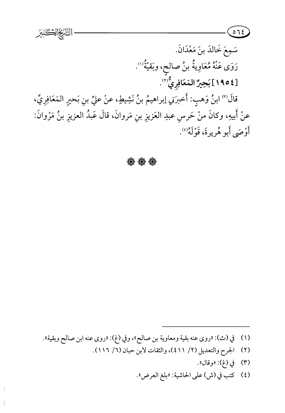 قَالَ (¬٣) ابنُ وَهبٍ: أَخبرَني إبراهيمُ بنُ نَشِيطٍ، عنْ عليِّ بنِ بَحيرٍ المَعافِرِيِّ، عنْ أَبيهِ، وكانَ منْ حَرسِ عبدِ العَزيزِ بنِ مَروانَ، قَالَ عَبدُ العزيزِ بنُ مَرْوانَ: أَوْصَى أَبو هُريرةَ، قَوْلَهُ (¬٤).
