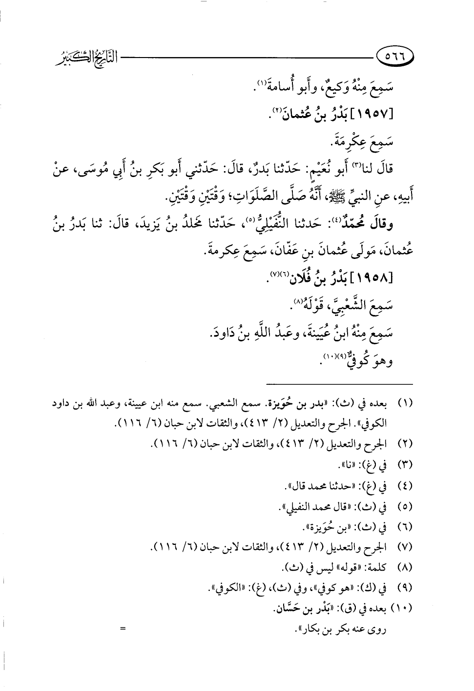 (¬١) بعده في (ث): "بدر بن حُوَيزة. سمع الشعبي. سمع منه ابن عيينة، وعبد اللَّه بن داود الكوفي". الجرح والتعديل (٢/ ٤١٣)، والثقات لابن حبان (٦/ ١١٦).