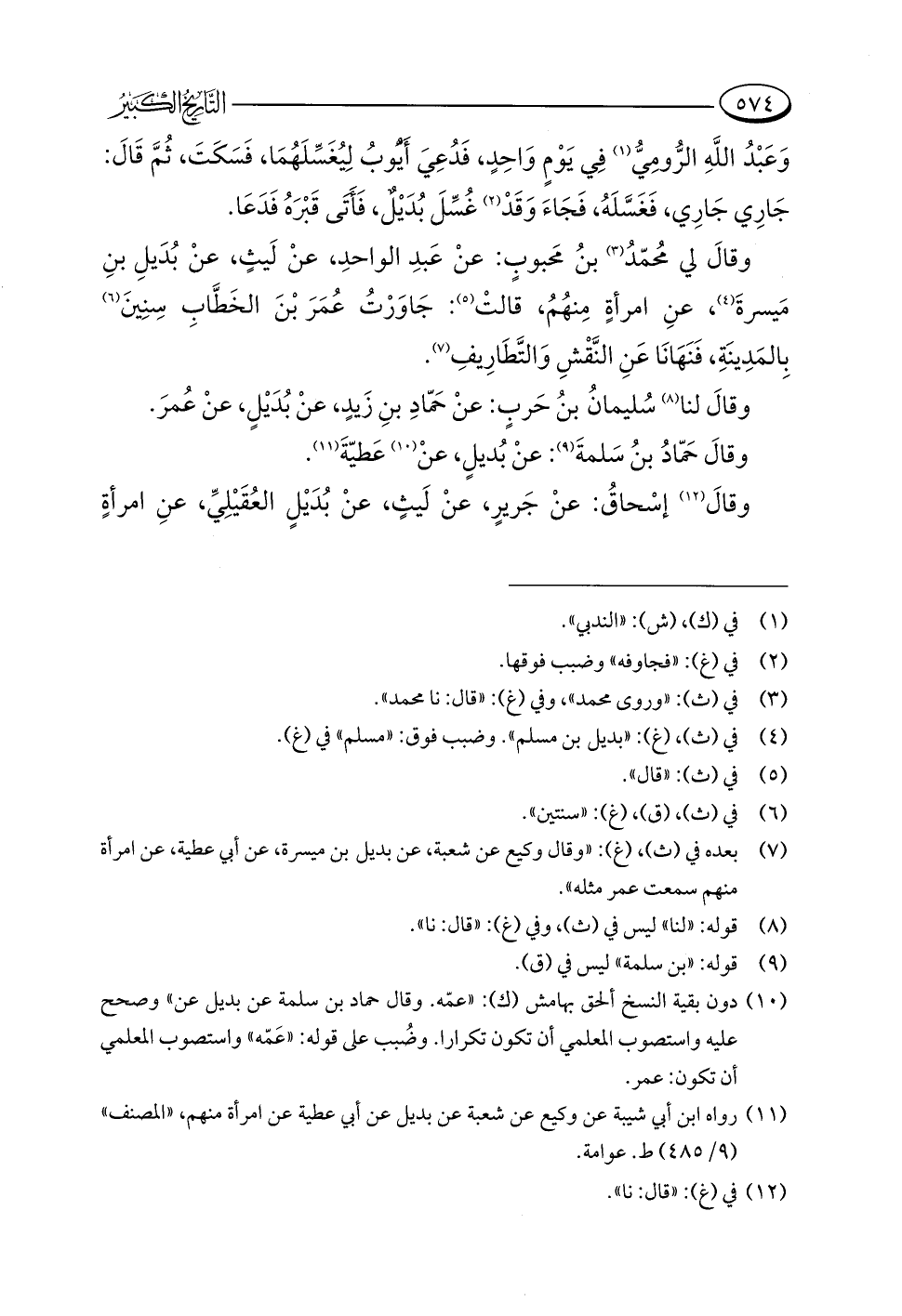 (¬١٠) دون بقية النسخ ألحق بهامش (ك): "عمّه. وقال حماد بن سلمة عن بديل عن" وصحح عليه واستصوب المعلمي أن تكون تكرارا. وضُبب على قوله: "عَمّه" واستصوب المعلمي أن تكون: عمر.