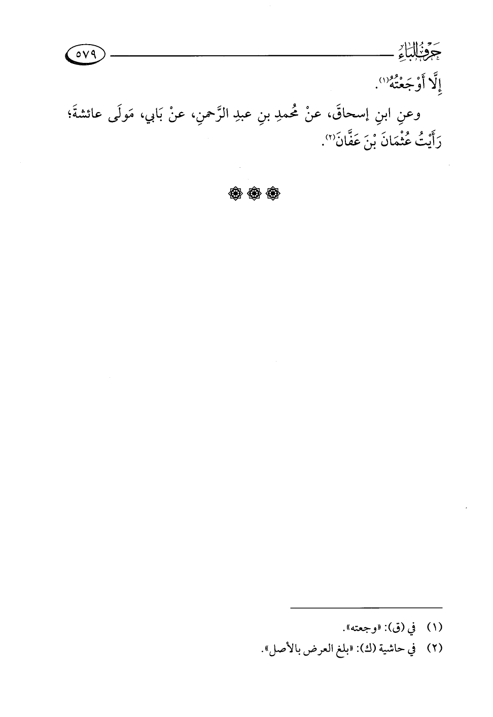 وعنِ ابنِ إسحاقَ، عنْ مُحمدِ بنِ عبدِ الرَّحمنِ، عنْ بَابي، مَولَى عائشةَ؛ رَأَيْتُ عُثْمَانَ بْنَ عَفَّانَ (¬٢).