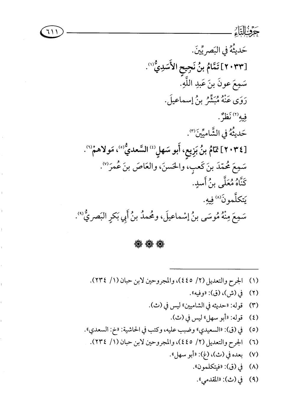 [٢٠٣٤] تمّامُ بنُ بَزِيعٍ، أَبو سَهلٍ (¬٤) السَّعديُّ (¬٥)، مَولاهمْ (¬٦).