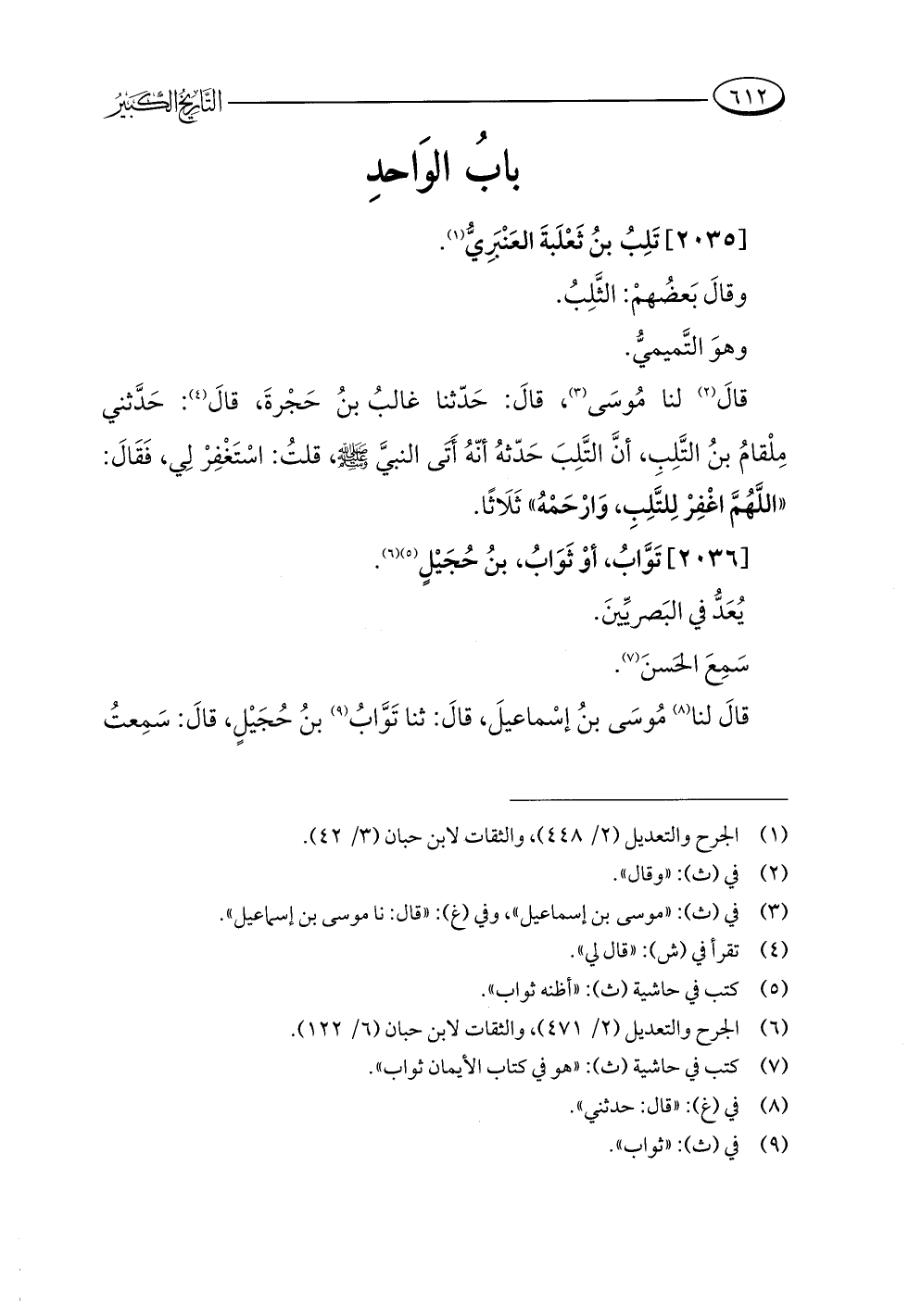 قالَ لنا (¬٨) مُوسَى بنُ إسْماعيلَ، قالَ: ثنا تَوَّابُ (¬٩) بنُ حُجَيْلٍ، قالَ: سَمِعتُ