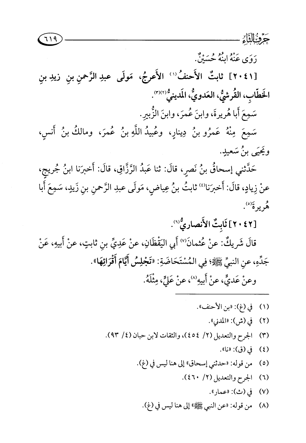 [٢٠٤١] ثابتٌ الأَحنفُ (¬١) الأَعرجُ، مَولَى عبدِ الرَّحمنِ بنِ زيدِ بنِ الخَطّابِ، القُرشيُّ، العَدويُّ، المَدينيُّ (¬٢) (¬٣).