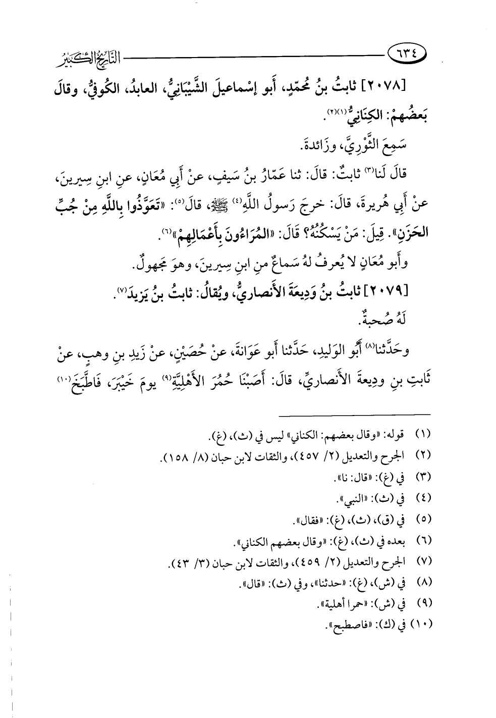 [٢٠٧٨] ثابتُ بنُ مُحمّدٍ، أَبو إسْماعيلَ الشَّيْبَانِيُّ، العابدُ، الكُوفيُّ، وقالَ بَعضُهمْ: الكِنَانِيُّ (¬١) (¬٢).