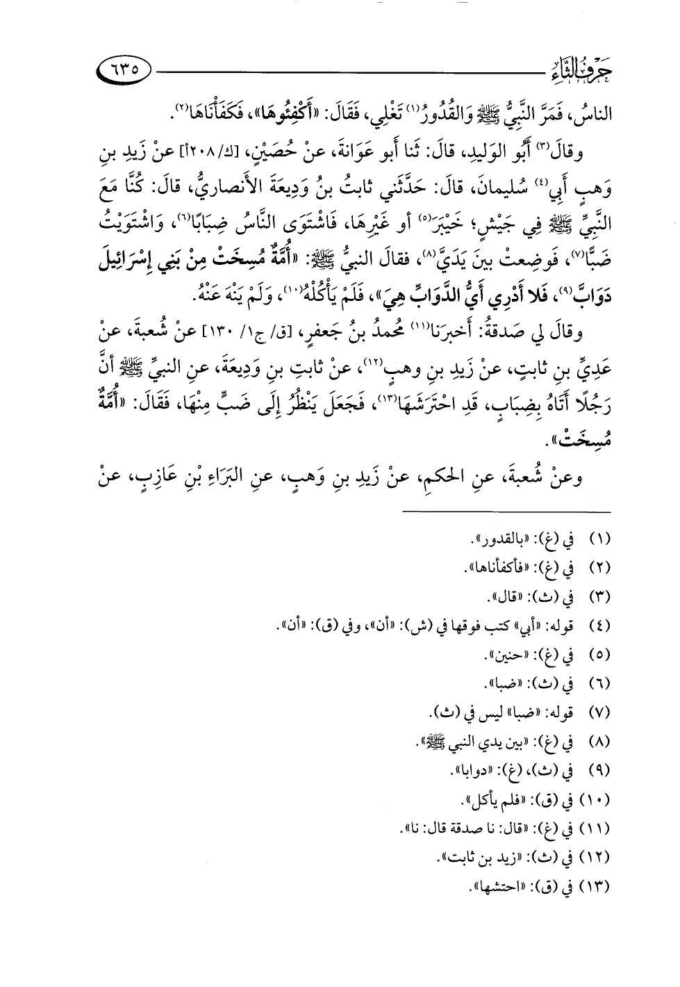 وقالَ لي صَدقةُ: أَخبرَنا (¬١١) مُحمدُ بنُ جَعفرٍ، عنْ شُعبةَ، عنْ عَدِيِّ بنِ ثابتٍ، عنْ زَيدِ بنِ وهبٍ (¬١٢)، عنْ ثابتِ بنِ وَدِيعَةَ، عنِ النبيِّ -صلى اللَّه عليه وسلم- أنَّ رَجُلًا أَتَاهُ بِضِبَابٍ، قَدِ احْتَرَشَهَا (¬١٣)، فَجَعَلَ يَنْظُرُ إِلَى ضَبٍّ مِنْهَا، فَقَالَ: "أُمَّةٌ مُسِخَتْ".