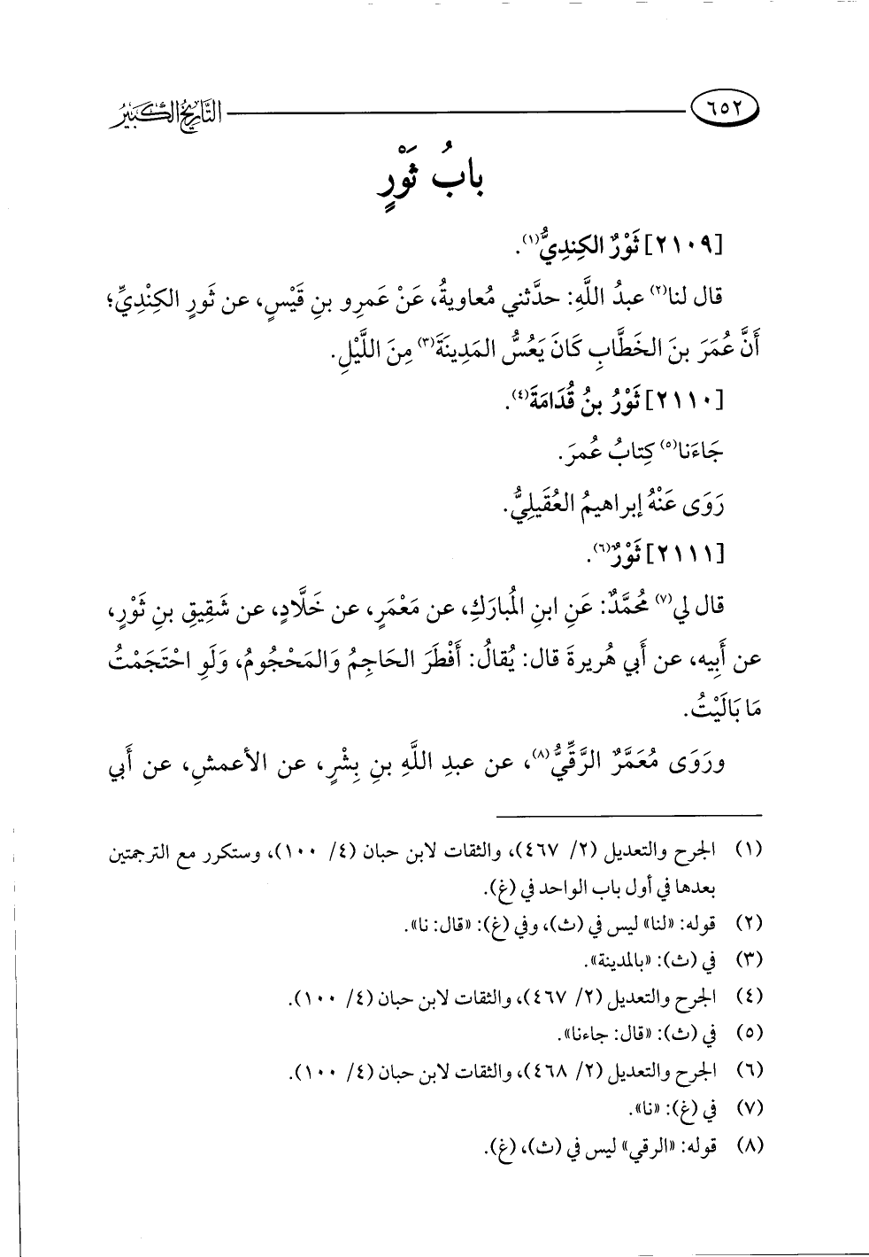 (¬١) الجرح والتعديل (٢/ ٤٦٧)، والثقات لابن حبان (٤/ ١٠٠)، وستكرر مع الترجمتين بعدها في أول باب الواحد في (غ).