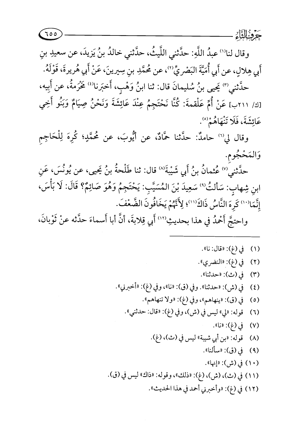 حدَّثني (¬٣) يَحيى بنُ سُليمانَ قال: ثنا ابنُ وَهْبٍ، أَخبَرنا (¬٤) مَخْرَمةُ، عن أَبِيه، عَنْ أُمِّ عَلْقمةَ: كُنَّا نَحْتَجِمُ عِنْدَ عَائِشَةَ وَنَحْنُ صِيَامٌ وَبَنُو أَخِي عَائِشَةَ، فَلَا تَنْهَاهُمْ (¬٥).