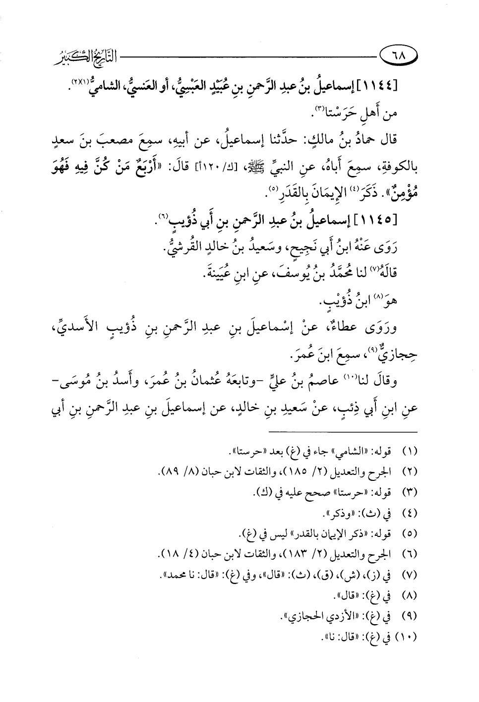 ورَوَى عطاءٌ، عنْ إسْماعيلَ بنِ عبدِ الرَّحمنِ بنِ ذُؤيبٍ الأَسديِّ، حِجازيٌّ (¬٩)، سمِعَ ابنَ عُمرَ.