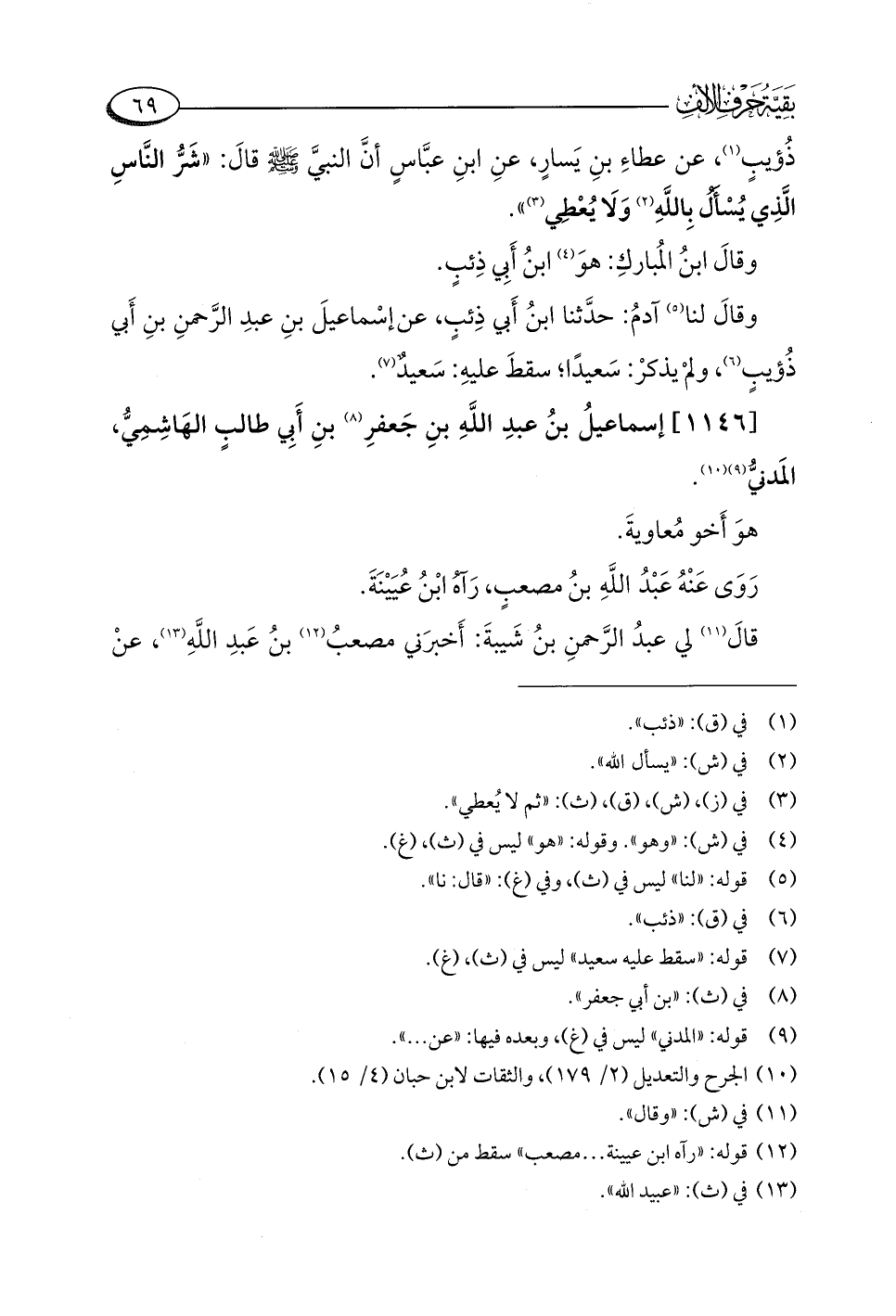 [١١٤٦] إسماعيلُ بنُ عبدِ اللَّهِ بنِ جَعفرِ (¬٨) بنِ أَبِى طالبٍ الهَاشِمِيُّ، المَدنيُّ (¬٩) (¬١٠).