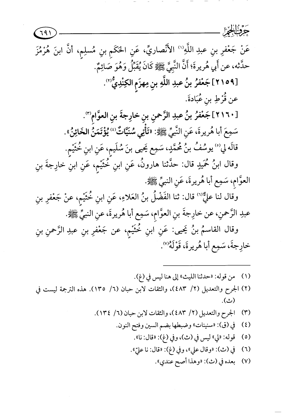 وقال ابنُ حُمَيدٍ قَالَ: حدَّثنا هارونُ، عَنِ ابنِ خُثَيْمٍ، عَنِ ابنِ خارِجةَ بنِ العوَّامِ، سَمِع أبا هُريرةَ، عَنِ النبيِّ -صلى اللَّه عليه وسلم-.