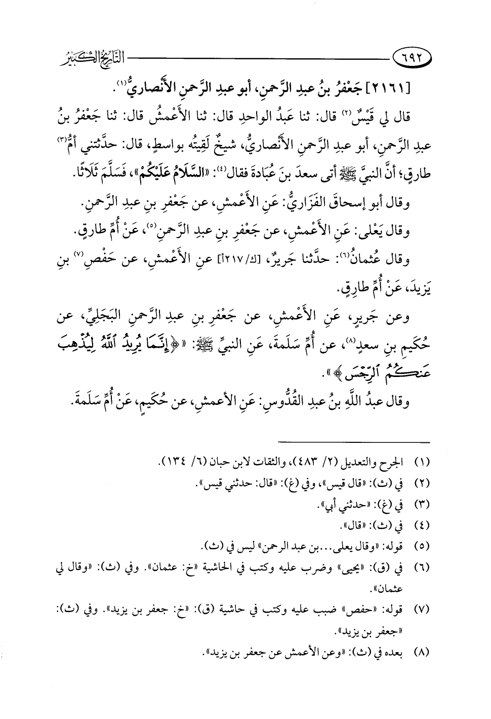 وعن جَريرٍ، عَنِ الأَعْمشِ، عن جَعْفرِ بنِ عبدِ الرَّحمنِ البَجَلِيِّ، عن حُكَيمِ بنِ سعدٍ (¬٨)، عن أُمِّ سَلَمةَ، عَنِ النبيِّ -صلى اللَّه عليه وسلم-: {إِنَّمَا يُرِيدُ اللَّهُ لِيُذْهِبَ عَنْكُمُ الرِّجْسَ} ".
