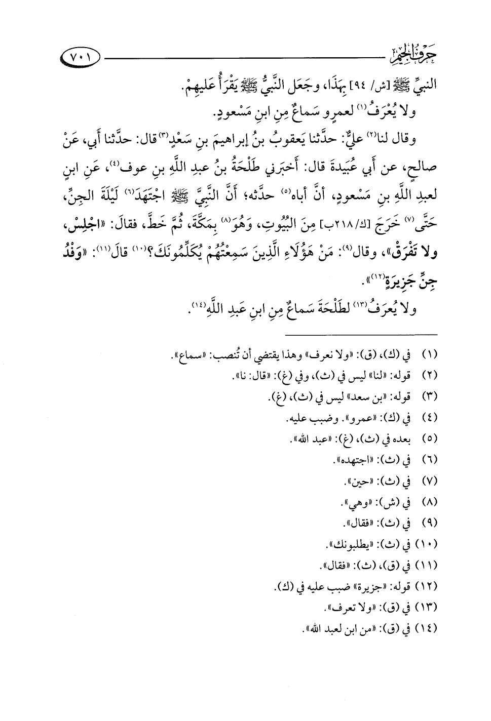 وقال لنا (¬٢) عليٌّ: حدَّثنا يَعقوبُ بنُ إبراهيمَ بنِ سَعْدٍ (¬٣) قَالَ: حدَّثنا أَبي، عَنْ صالحٍ، عن أَبي عبَيدةَ قَالَ: أَخبَرني طَلْحَةُ بنُ عبدِ اللَّهِ بنِ عوف (¬٤)، عَنِ ابنٍ لعبدِ اللَّهِ بنِ مَسْعودٍ، أنَّ أباه (¬٥) حدَّثه، أَنَّ النَّبِيَّ -صلى اللَّه عليه وسلم- اجْتَهَدَ (¬٦) لَيْلَةَ الجِنِّ، حَتَّى (¬٧) خَرَجَ مِنَ البُيُوتِ، وَهُوَ (¬٨) بِمَكَّةَ، ثُمَّ خَطَّ، فقالَ: "اجْلِسْ، وَلَا تَفْرَقْ"، وقال (¬٩): مَنْ هَؤُلَاءِ الَّذِينَ سَمِعْتُهُمْ يُكَلِّمُونَكَ؟ (¬١٠) قالَ (¬١١): "وَفْدُ جِنِّ جَزِيرَةٍ (¬١٢) ".