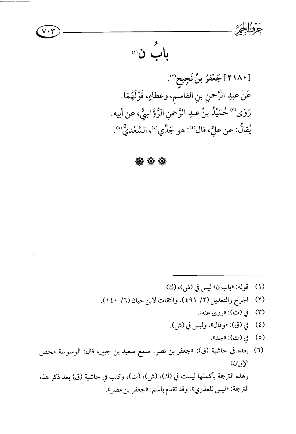 (¬٦) بعده في حاشية (ق): "جعفر بن نصر. سمع سعيد بن جبير، قال: الوسوسة محض الإيمان".
