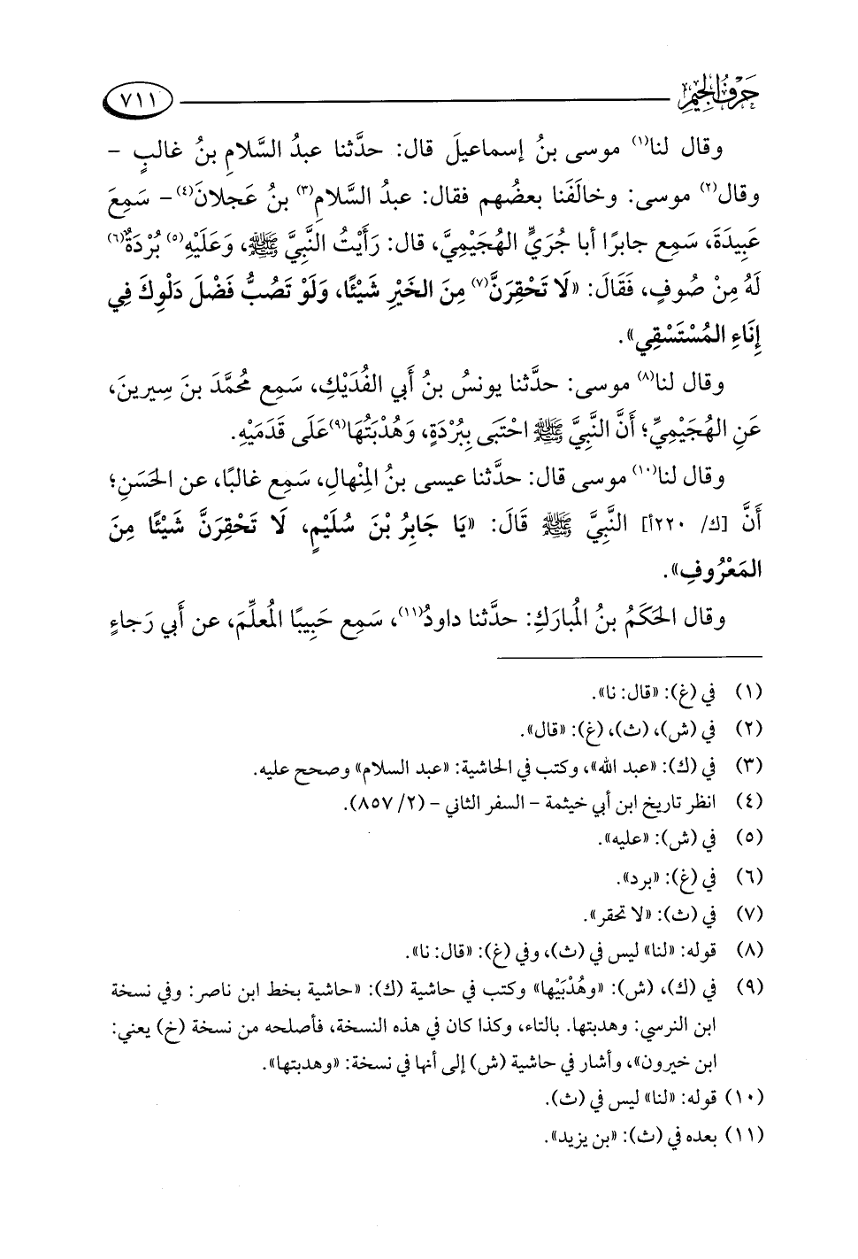 وقال لنا (¬١) موسى بنُ إسماعيلَ قَالَ: حدَّثنا عبدُ السَّلامِ بنُ غالبٍ -وقال (¬٢) موسى: وخالَفَنا بعضُهم فقال: عبدُ السَّلامِ (¬٣) بنُ عَجلانَ (¬٤) - سَمِعَ عَبِيدَةَ، سَمِع جابرًا أبا جُرَيٍّ الهُجَيْمِيَّ، قَالَ: رَأَيْتُ النَّبِيَّ -صلى اللَّه عليه وسلم-، وَعَلَيْهِ (¬٥) بُرْدَةٌ (¬٦) لَهُ مِنْ صُوفٍ، فَقَالَ: "لَا تَحْقِرَنَّ (¬٧) مِنَ الخَيْرِ شَيْئًا، وَلَوْ تَصُبُّ فَضْلَ دَلْوِكَ في إِنَاءِ المُسْتَسْقِي".