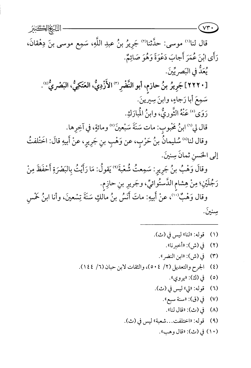 [٢٢٢٠] جَرِيرُ بنُ حازمٍ، أَبُو النَّضْرِ (¬٣) الأَزْدِيُّ، العَتَكِيُّ، البَصْريُّ (¬٤).