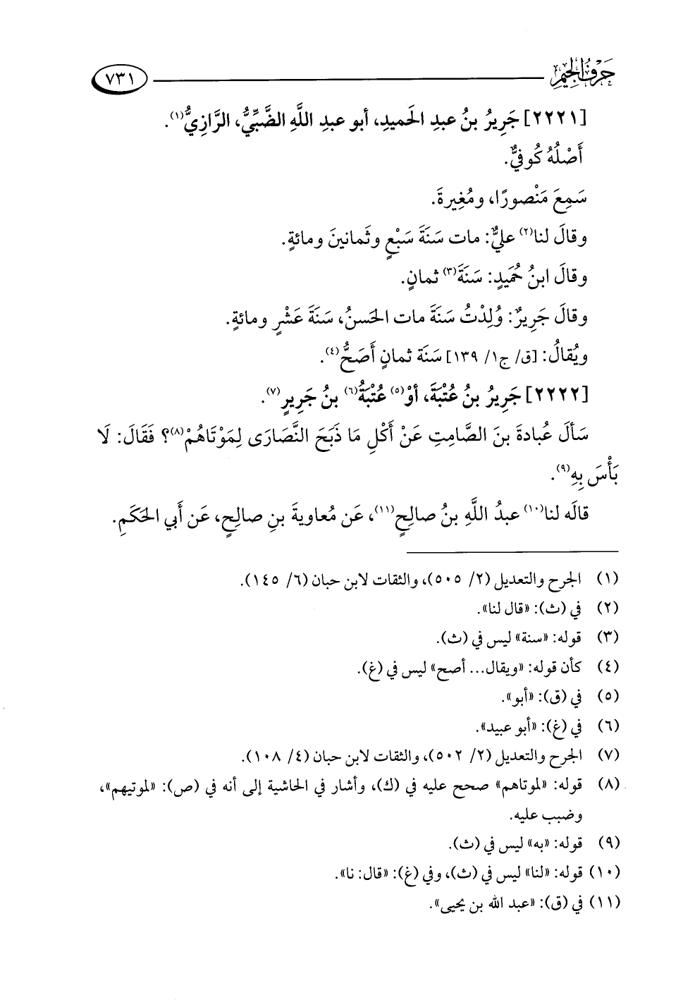 [٢٢٢١] جَرِيرُ بنُ عبدِ الحَميدِ، أَبُو عبدِ اللَّهِ الضَّبِّيُّ، الرَّازِيُّ (¬١).