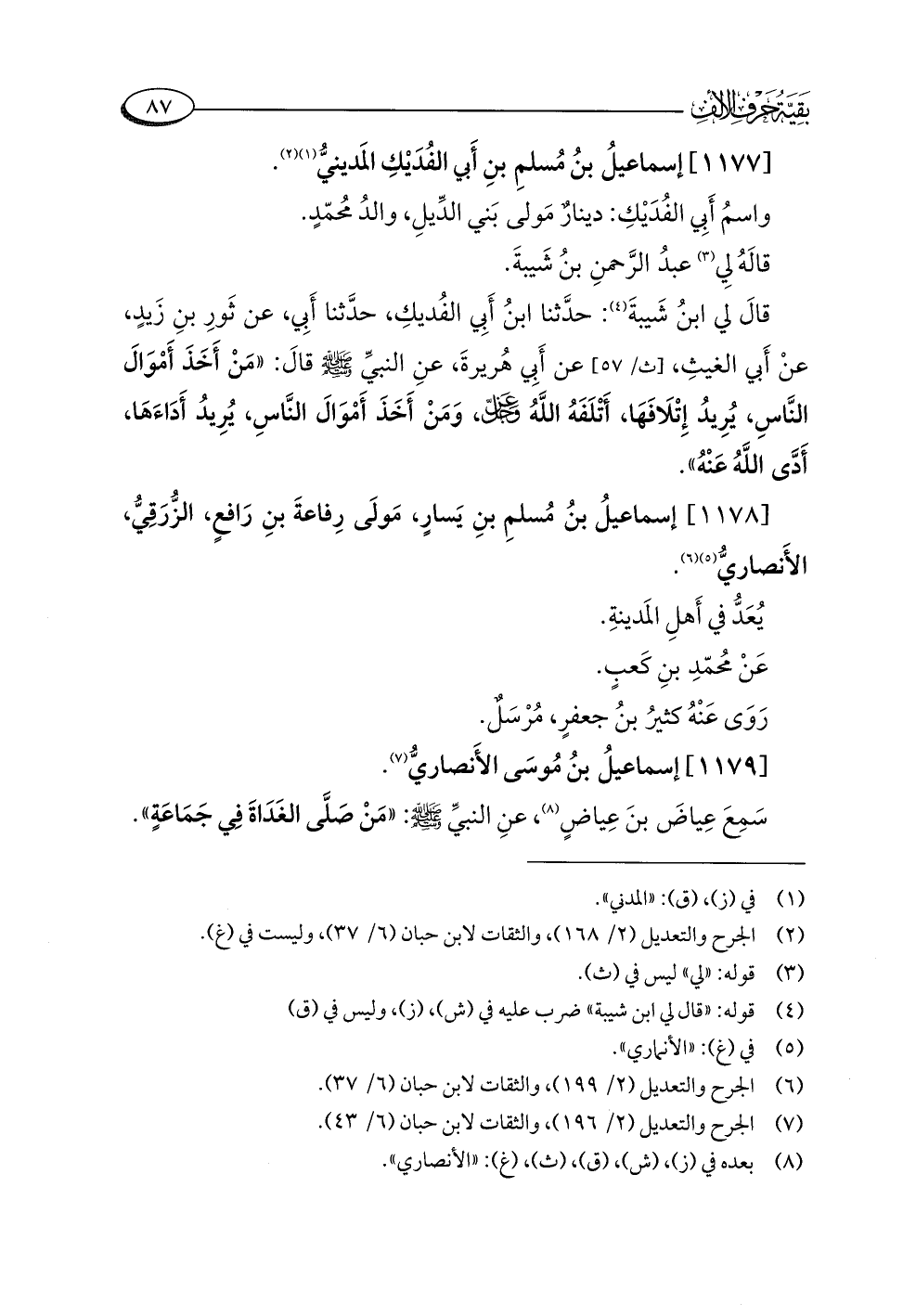 [١١٧٨] إسماعيلُ بنُ مُسلمِ بنِ يَسارٍ، مَولَى رِفاعةَ بنِ رَافعٍ، الزُّرَقِيُّ، الأَنصاريُّ (¬٥) (¬٦).