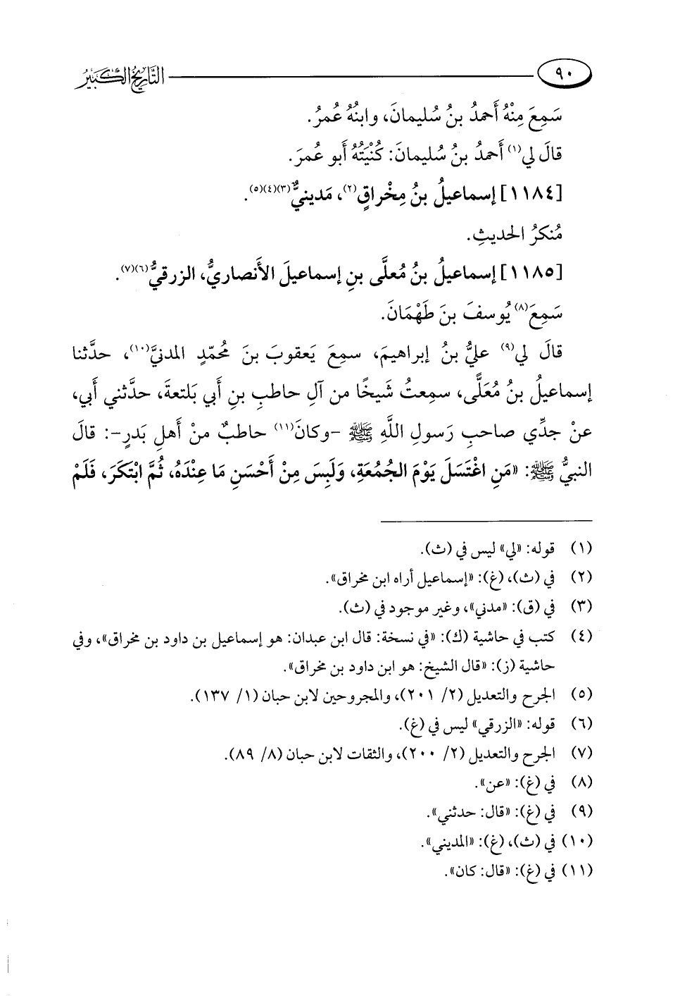 قالَ لي (¬٩) عليُّ بنُ إبراهيمَ، سمِعَ يَعقوبَ بنَ مُحمّدٍ المدنيَّ (¬١٠)، حدَّثنا إسماعيلُ بنُ مُعَلًّى، سمِعتُ شَيخًا من آلِ حاطبِ بنِ أَبي بَلتعةَ، حدَّثني أَبي، عنْ جدِّي صاحبِ رَسولِ اللَّهِ -صلى اللَّه عليه وسلم- وكانَ (¬١١) حاطبٌ منْ أَهلِ بَدرٍ-: قالَ النبيُّ -صلى اللَّه عليه وسلم-: "مَنِ اغْتَسَلَ يَوْمَ الجُمُعَةِ، وَلَبِسَ مِنْ أَحْسَنِ مَا عِنْدَهُ، ثُمَّ ابْتكَرَ، فَلَمْ