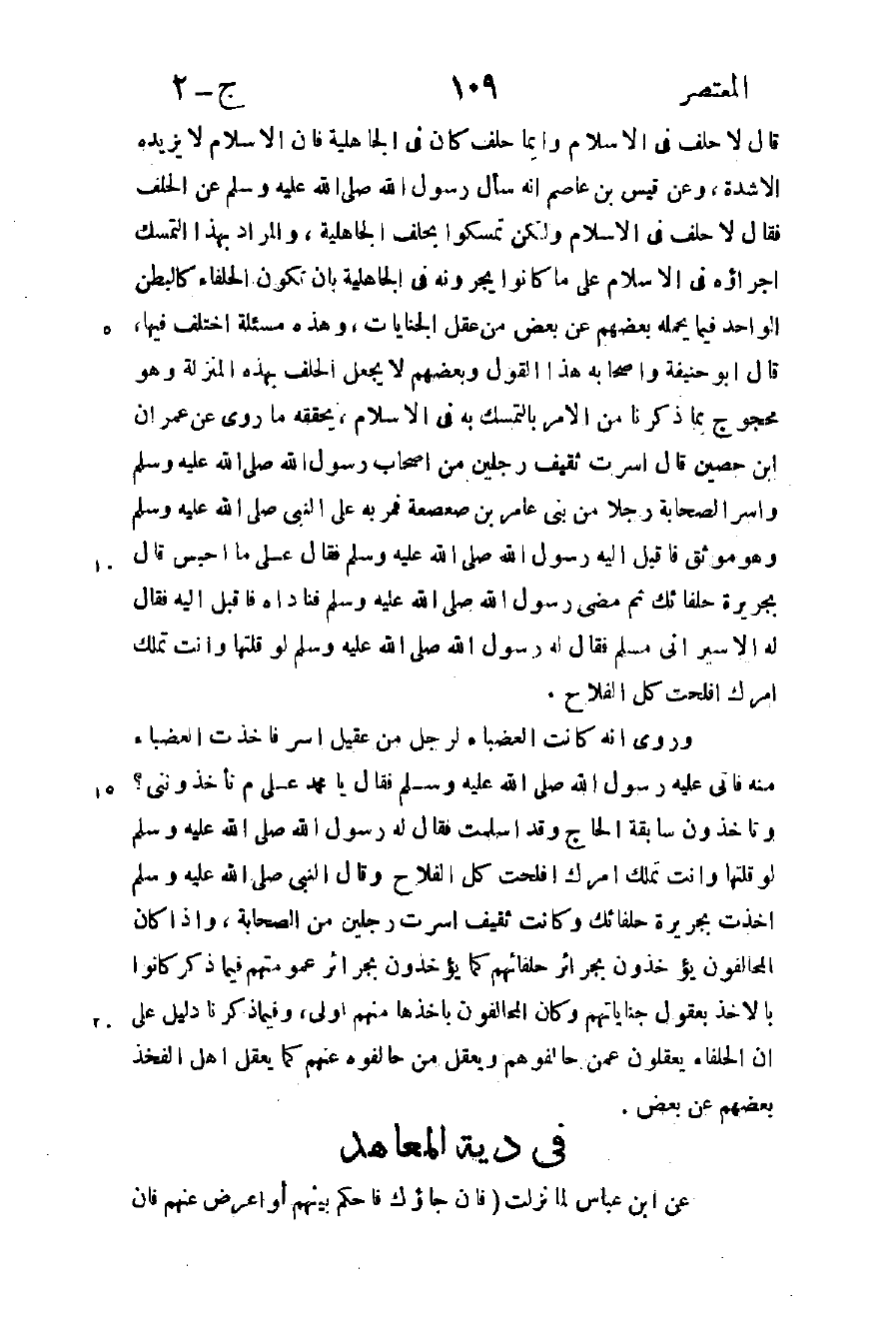 قال: "لا حلف في الإسلام وإيما حلف كان في الجاهلية فإن الإسلام لا يزيده الا شدة" وعن قيس بن عاصم أنه سأل رسول الله صلى الله عليه وسلم عن الحلف فقال: "لا حلف في الإسلام ولكن تمسكوا بحلف الجاهلية" والمراد بهذا التمسك إجراؤه في الإسلام على ما كانوا يجرونه في الجاهلية بأن تكون الحلفاء كالبطن الواحد فيما يحمله بعضهم عن بعض من عقل الجنايات وهذه مسئلة اختلف فيها قال أبو حنيفة وأصحابه هذا القول وبعضهم لا يجعل الحلف بهذه المنزلة وهو محجوج بما ذكرنا من الأمر بالتمسك به في الإسلام يحققه ما روى عن عمران بن حصين قال: أسرت ثقيف رجلين من أصحاب رسول الله صلى الله عليه وسلم وأسر الصحابة رجلا من بني عامر بن صعصعة فمر به على النبي صلى الله عليه وسلم وهو موثق فأقبل إليه رسول الله صلى الله عليه وسلم فقال: على ما أحبس قال: "بجريرة حلفائك" ثم مضى رسول الله صلى الله عليه وسلم فناداه فأقبل إليه فقال له الأسير: أني مسلم فقال له رسول الله صلى الله عليه وسلم: "لو قلتها وأنت تملك أمرك أفلحت كل الفلاح".