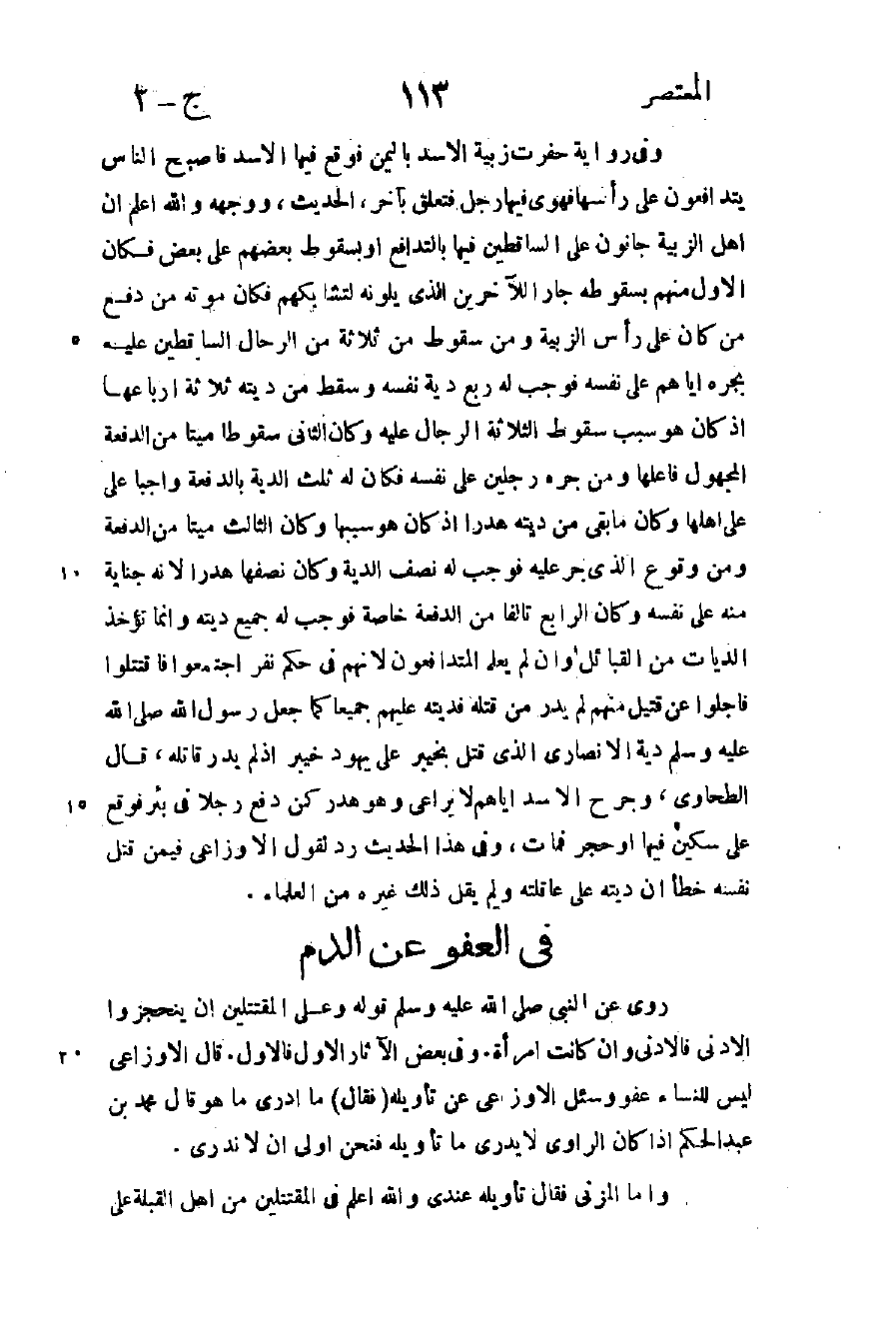 روى عن النبي صلى الله عليه وسلم قوله: "وعلى المقتتلين أن ينحجزوا الأدنى فالأدنى وإن كانت امرأة" وفي بعض الآثار الأول فالأول قال الأوزاعي: ليس للنساء عفو وسئل الأوزاعي عن تأيله "فقال" ما أدري ما هو قال محمد بن عبد الحكم: إذا كان الراوي لا يدري ما تأويله فنحن أولى إن لا ندري.