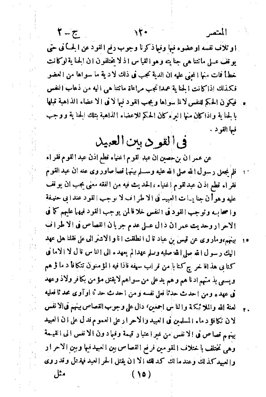عن عمران بن حصين أن عبد لقوم أغنياء قطع أذن عبد القوم فقراء فلم يجعل رسول الله صلى الله عليه وسلم بينهما قصاصا وروى عنه أن عبد القوم فقراء قطع أذن عبد لقوم أغنياء الحديث فيه من الفقه معنى يجب أن يوقف عليه وهو أن جنايات العبد في الأطراف لا يوجب القود عند أبي حنيفة وأصحابه وتوجب القود في النفس خلافا لمن يوجب القود فيهما عليهم كما في الأحرار وحديث عمران دال على عدم جريان القصاص في الأطراف بينهم وما روى عن قيس بن عباد قال: انطلقت أنا والأشتر إلى علي فقلنا: هل عهد إليك رسول الله صلى الله عليه وسلم عهدا لم يعهده إلى الناس قال: لا إلا ما في كتابي هذا فأخرج كتابا من قراب سيفه فإذا فيه: المؤمنون تتكافأ دماؤهم ويسعى بذمتهم أدناهم وهم يد على من سواهم لا يقتل مؤمن بكافر ولاذو عهد في عهده ومن أحدث حدثا فعلى نفسه ومن أحدث حدثا أو آوى محدثا فعليه لعنة الله والملائكة والناس أجمعين دال على وجوب القصاص بينهم في الأنفس لأن تكافؤ دماء المسلمين في العبيد والأحرار على العموم فدل على أن العبيد بينهم قصاص في الأنفس من غير اعتبار قيمة وفيما دون الأنفس إلى القيمة وهي تختلف باختلاف المقومين فرفع القصاص بين العبيد فيها وبين الأحرار والعبيد كذلك وعند مالك كذلك إلا أن يقتل الحر العبد فيقتل وقد روى مثل مذهب أبي حنيفة أنه لا قود بين العبيد فيما دون النفس عن عبد الله بن مسعود.