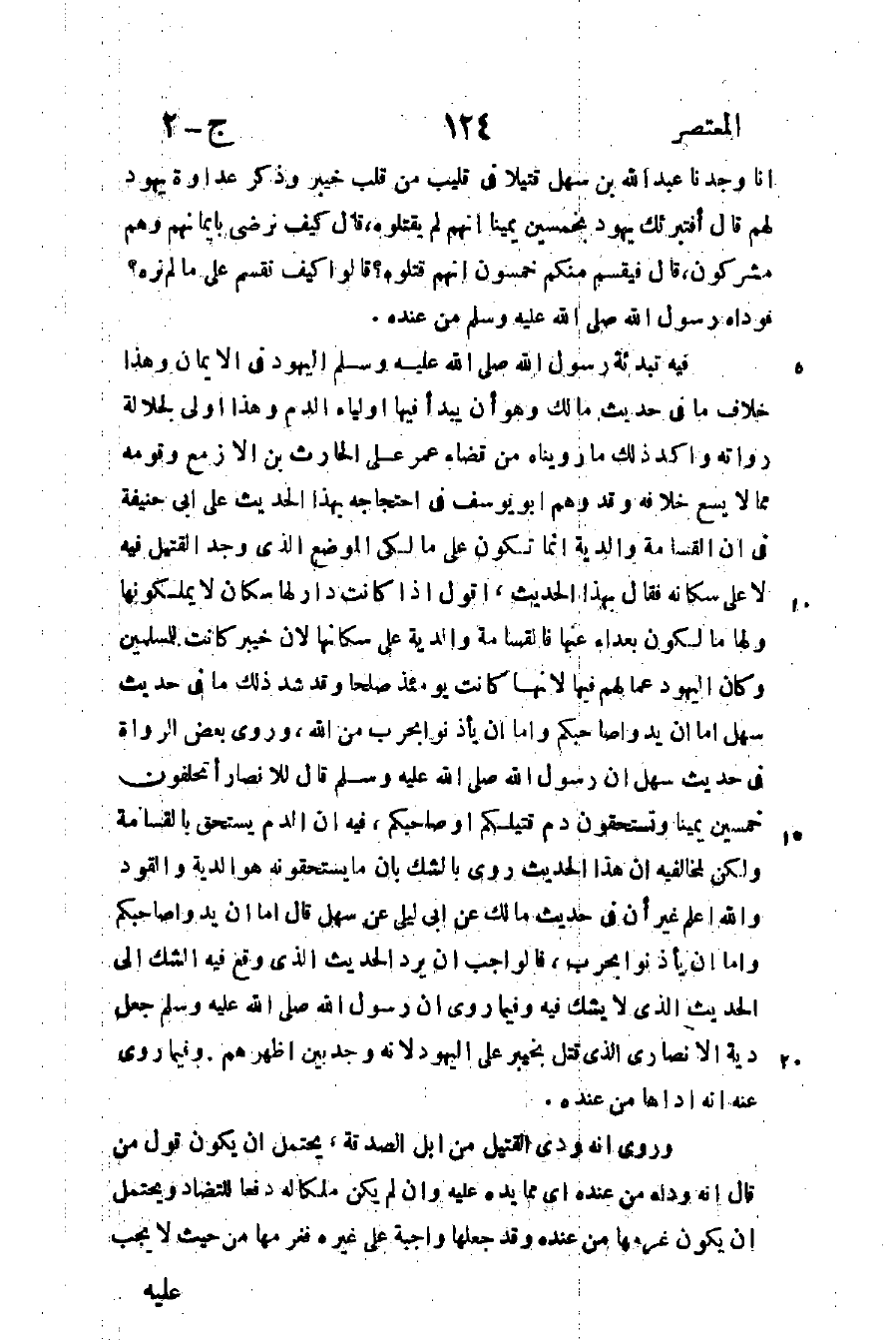 إنا وجدنا عبد الله بن سهل قتيلا في قليب من قلب خيبر وذكر عداوة يهود لهم قال: "أفتبرئك يهود بخمسين يمينا أنهم لم يقتلوه" قال: كيف نرضى بإيمانهم وهم مشركون قال: "فيقسم منكم خمسون أنهم قتلوه" قالوا: كيف نقسم على ما لم نره فوداه رسول الله صلى الله عليه وسلم من عنده.