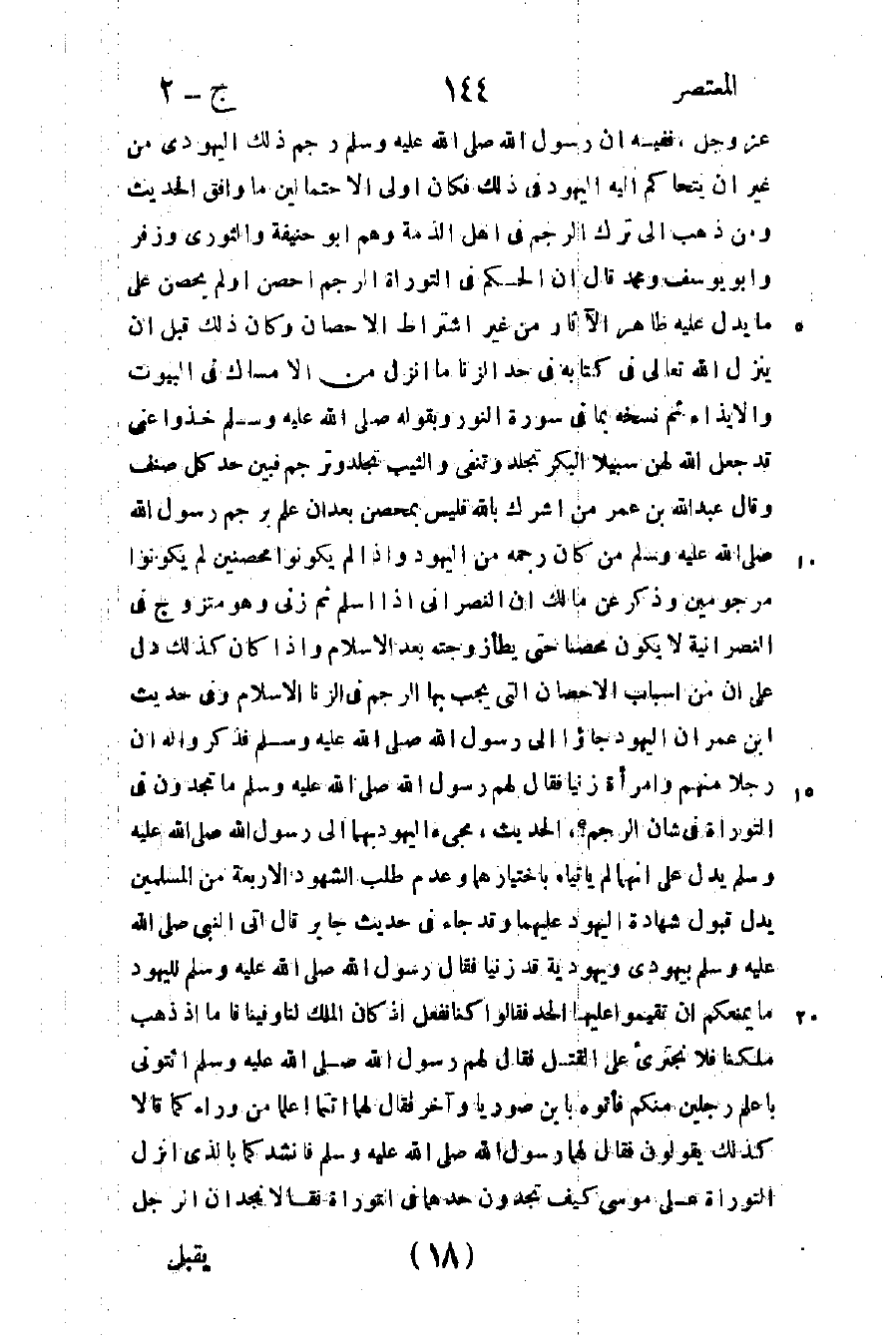 عز وجل"، ففيه أن رسول الله صلى الله عليه وسلم رجم ذلك اليهودي من غير أن يتحاكم إليه اليهود في ذلك فكان أولى الاحتمالين ما وافق الحديث ومن ذهب إلى ترك الرجم في أهل الذمة وهم أبو حنيفة والثورى وزفر وأبو يوسف ومحمد قال: إن الحكم في التوراة الرجم احصن أو لم يحصن على ما يدل عليه ظاهر الاثار من غير اشتراط الاحصان وكان ذلك قبل ان ينزل الله تعالى في كتابه في حد الزنا ما انزل من الإمساك في البيوت والإيذاء ثم نسخه بما في سورة النور وبقوله صلى الله عليه وسلم: "خذوا عني قد جعل الله لهن سبيلا البكر تجلد وتنفى والثيب تجلد وترجم" فبين حد كل صنف وقال عبد الله بن عمر: من أشرك بالله فليس بمحصن بعدان علم برجم رسول الله صلى الله عليه وسلم من كان رجمه من اليهود وإذا لم يكونوا محصنين لم يكونوا مرجومين وذكر عن مالك أن النصراني إذا اسلم ثم زنى وهو متزوج في النصرانية لا يكون محصنا حتى يطأ زوجته بعد الإسلام وإذا لم كان كذلك دل على ان من أسباب الإحصان التي يجب بها الرجم في الزنا الإسلام وفي حديث ابن عمر ان اليهود جاؤوا إلى رسول الله صلى الله صلى الله عليه وسلم فذكر وله ان رجلا منهم وامرأة زنيا فقال لهم رسول الله صلى الله عليه وسلم: "ما تجدون في التوراة في شان الرجم"؟، الحديث، مجيء اليهود بهما إلى رسول الله صلى الله عليه وسلم يدل على أنهما لم يأتياه باختيارهما وعدم طلب الشهود الأربعة من المسلمين يدل قبول شهادة اليهود عليهما وقد جاء في حديث جابر قال: أتى النبي صلى الله عليه وسلم بيهودي ويهودية قد زنيا فقال رسول الله صلى الله عليه وسلم لليهود: "ما يمنعكم أن تقيموا عليها الحد"؟ فقالوا: كنا نفعل إذ كان الملك لنا وفينا فأما إذ ذهب ملكنا فلا نجترئ على القتل فقال لهم رسول الله صلى الله عليه وسلم: "ائتوني بأعلم رجلين منكم" فأتوه بابن صوريا وآخر فقال لهما: "أتتما علما من وراء كما" قالا: كذلك يقولون فقال لهما رسول الله صلى الله عليه وسلم: "فأنشدكما بالذي أنزل التوراة على موسى كيف تجدون حدهما في التوراة"؟ فقالا: نجد أن الرجل