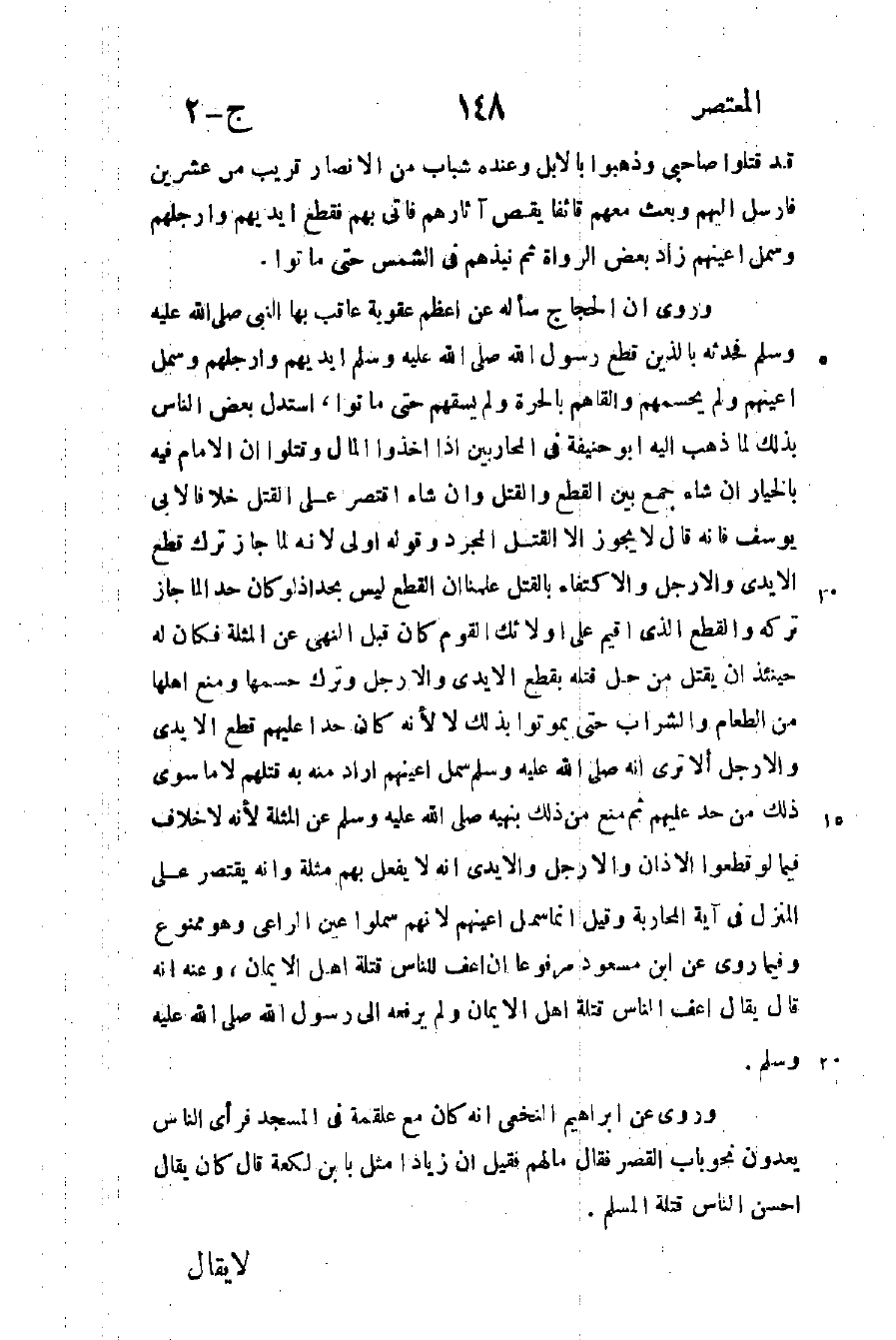 وروي أن الحجاج سأله عن أعظم عقوبة عاقب بها النبي صلى الله عليه وسلم فحدثه بالذين قطع رسول الله صلى الله عليه وسلم أيديهم وأرجلهم وسمل أعينهم ولم يحسمهم وألقاهم بالحرة ولم يسقهم حتى ماتوا، استدل بعض الناس بذلك لما ذهب إليه أبو حنيفة في المحاربين إذا أخذوا المال وقتلوا أن الإمام فيه بالخيار إن شاء جمع بين القطع والقتل وإن شاء اقتصر على القتل خلافا لأبي يوسف فإنه قال: لا يجوز إلا القتل المجرد وقوله: أولى لأنه لما جاز ترك قطع الأيدي والأرجل والاكتفاء بالقتل علمنا أن القطع ليس بحد إذا لو كان حدا لما جاز تركه والقطع الذي أقيم على أولئك القوم كان قبل النهي عن المثلة فكان له حيئذ أن يقتل من حل قتله بقطع الأيدي والأرجل وترك حسمها ومنع أهلها من الطعام والشراب حتى يموتوا بذلك لا لأنه كان حدا عليهم قطع الأيدي والأرجل ألا ترى أنه صلى الله عليه وسلم سمل أعينهم أراد منه به قتلهم لا ما سوى ذلك من حد عليهم ثم منع من ذلك بنهيه صلى الله عليه وسلم عن المثلة لأنه لا خلاف فيما لو قطعوا الآذان والأرجل والأيدي أنه لا يفعل بهم مثلة وأنه يقتصر على المنزل في آية المحاربة وقيل أنما سمل أعينهم لأنهم سملوا عين الراعي وهو ممنوع وفيما روي عن ابن مسعود مرفوعا: أن اعف للناس قتلة أهل الإيمان وعنه أنه قال: يقال: اعف الناس قتلة أهل الإيمان ولم يرفعه إلى رسول الله صلى الله عليه وسلم.