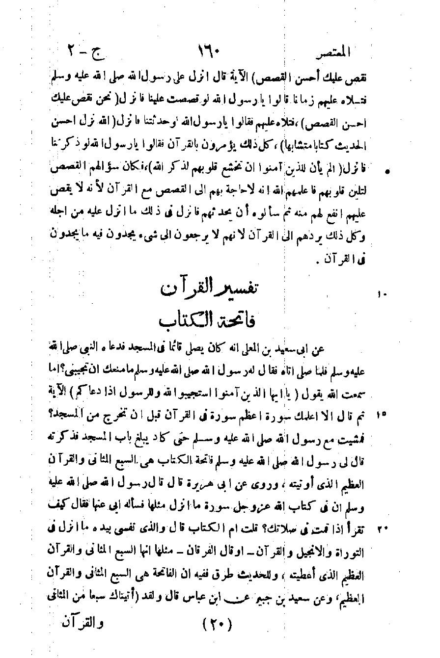 عن أبي سعيد بن المعلي أنه كان يصلي قائما في المسجد فدعاه النبي صلى الله عليه وسلم فلما صلى أتاه فقال له رسول الله صلى الله عليه وسلم: "ما منعك أن تجيبني؟ أما سمعت الله يقول: {يَا أَيُّهَا الَّذِينَ آمَنُوا اسْتَجِيبُوا لِلَّهِ وَلِلرَّسُولِ إِذَا دَعَاكُمْ} " الآية ثم قال: "ألا أعلمك سورة أعظم سورة في القرآن قبل أن تخرج من المسجد" فمشيت مع رسول الله صلى الله عليه وسلم حتى كاد يبلغ باب المسجد فذكرته قال لي رسول الله صلى الله عليه وسلم: "فاتحة الكتاب هي السبع المثانى والقرآن العظيم الذي أوتيته"، وروى عن أبي هريرة قال: قال رسول الله صلى الله عليه وسلم: "أن في كتاب الله عز وجل سورة ما أنزل مثلها" فسأله أبي عنها فقال: "كيف تقرأ إذا قمت في صلاتك"؟ قلت: أم الكتاب قال: "والذي نفسي بيده ما أنزل في التوراة والإنجيل والقرآن -أو قال: الفرقان- مثلها إنها السبع المثانى والقرآن العظيم الذي أعطيته"، وللحديث طرق ففيه أن الفاتحة هي السبع المثانى والقرآن العظيم، وعن سعيد بن جبير عن ابن عباس قال: {وَلَقَدْ آتَيْنَاكَ سَبْعاً مِنَ الْمَثَانِي