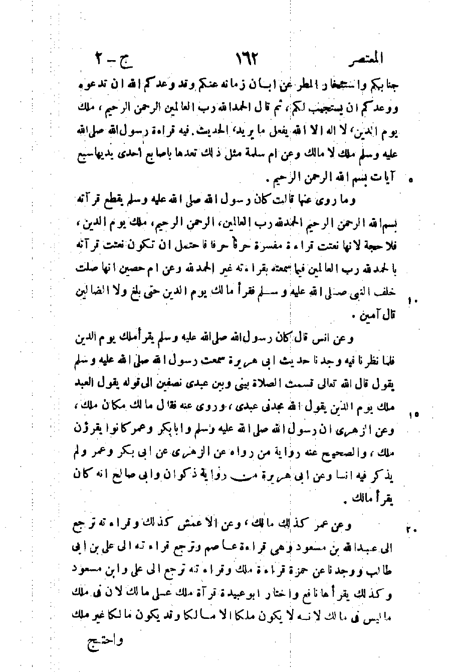 وعن أنس قال: كان رسول الله صلى الله عليه وسلم يقرأ ملك يوم الدين فلما نظرنا فيه وجدنا حديث أبي هريرة سمعت رسول الله صلى الله عليه وسلم يقول: "قال الله تعالى: قسمت الصلاة بيني وبين عبدي نصفين إلى قوله: يقول العبد: ملك يوم الدين يقول الله: مجدني عبدي"، وروي عنه فقال: مالك مكان ملك وعن الزهري أن رسول الله صلى الله عليه وسلم وأبا بكر وعمر كانوا يقرؤن ملك والصحيح عنه رواية من رواه عن الزهري عن أبي بكر وعمر ولم يذكر فيه أنسا وعن أبي هريرة من رواية ذكوان وأبي صالح أنه كان يقرأ مالك.