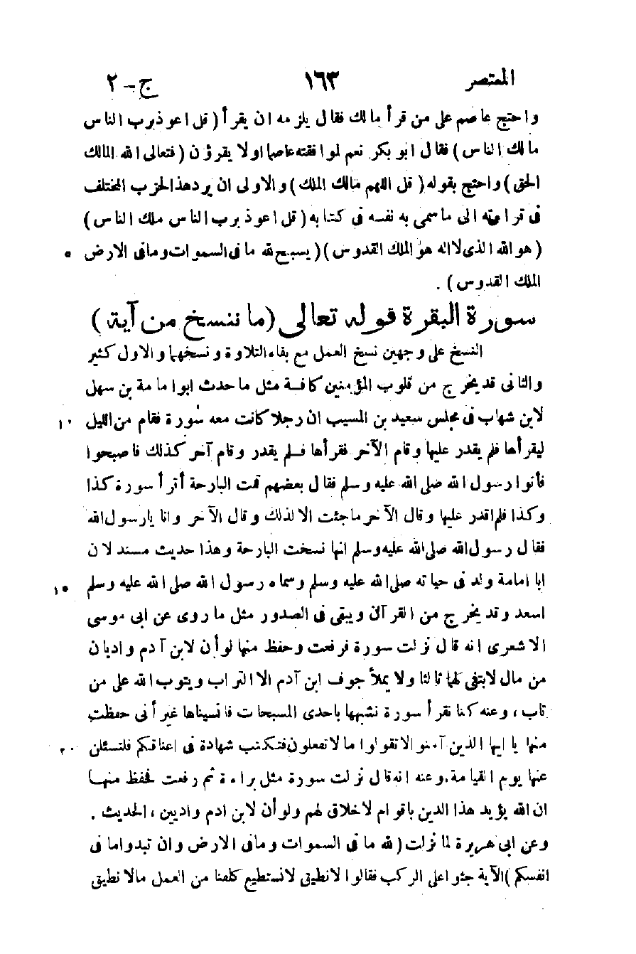 النسخ على وجهين نسخ العمل مع بقاء التلاوة ونسخهما والأول كثير والثاني قد يخرج من قلوب المؤمنين كافة مثل ما حدث أبو أمامة بن سهل لابن شهاب في مجلس سعيد بن المسيب أن رجلا كانت معه سورة فقام من الليل ليقرأها فلم يقدر عليها وقام الآخر فقرأها فلم يقدر وقام آخر كذلك فأصبحوا فأتوا رسول الله صلى الله عليه وسلم فقال بعضهم قمت البارحة أقرأ سورة كذا وكذا فلم أقدر عليها وقال الآخر: ما جئت إلا لذلك وقال الآخر: وأنا يا رسول الله فقال رسول الله صلى الله عليه وسلم: "أنها نسخت البارحة". وهذا حديث مسند لأن أبا أمامة ولد في حياته صلى الله عليه وسلم وسماه رسول الله صلى الله عليه وسلم أسعد وقد يخرج من القرآن ويبقى في الصدور مثل ما روي عن أبي موسى الأشعري أنه قال: نزلت سورة فرفعت وحفظ منها لو أن لابن آدم واديان من مال لابتغى لهما ثالثا ولا يملأ جوف ابن آدم إلا التراب ويتوب الله على من تاب وعنه كنا نقرأ سورة نشبهها بإحدى المسبحات فأنسيناها غير أني حفظت منها يا أيها الذين آمنوا لا تقولوا ما لا تفعلون فتكتب شهادة في اعناقكم فلتسئلن عنها يوم القيامة وعنه أنه قال: نزلت سورة براءة ثم رفعت فحفظ منها أن الله يؤيد هذا الدين بأقوام لا خلاق لهم ولو أن لابن آدم واديين، الحديث. وعن أبي هريرة لما نزلت: {لِلَّهِ مَا فِي السَّمَاوَاتِ وَمَا فِي الْأَرْضِ وَإِنْ تُبْدُوا مَا فِي أَنْفُسِكُمْ} الآية جثوا على الركب فقالوا: لا نطيق لا نستطيع كلفنا من العمل ما لا نطيق