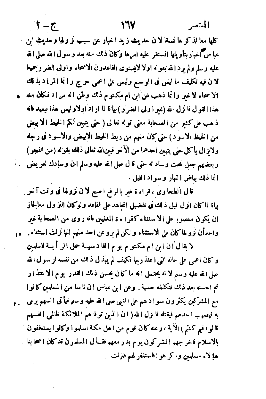 كلها معا لذكرها نسقا لأن حديث زيد أخبار عن سبب نزولها وحديث ابن عباس أخبار بتأويلها المستقر عليه أمرها وكان ذلك منه بعد رسول الله صلى الله عليه وسلم ولم يرد الله بقوله أولا لا يستوي القاعدون الأصحاء وأولي الضرر جميعا لأن فيه تكليف ما ليس في الوسع وليس على أعمى حرج وإنما المراد بذلك الأصحاء لا غير وإنما ذهب عن ابن أم مكتوم ذلك وظن أنه مراد فكان منه هذا القول فأنزل الله: {غَيْرُ أُولِي الضَّرَرِ} بيانا لما أراد أولا وليس هذا ببعيد فإنه ذهب على كثير من الصحابة معنى قوله تعالى: {حَتَّى يَتَبَيَّنَ لَكُمُ الْخَيْطُ الْأَبْيَضُ مِنَ الْخَيْطِ الْأَسْوَدِ} حتى كان منهم من ربط الخيط الأبيض والأسود في رجله ولا يزال يأكل حتى يتبين أحدهما من الآخر فبين الله تعالى ذلك بقوله: {مِنَ الْفَجْرِ} وبعضهم جعل تحت وسادته حتى قال صلى الله عليه وسلم: "أن وسادك لعريض إنما ذلك بياض النهار وسواد الليل".