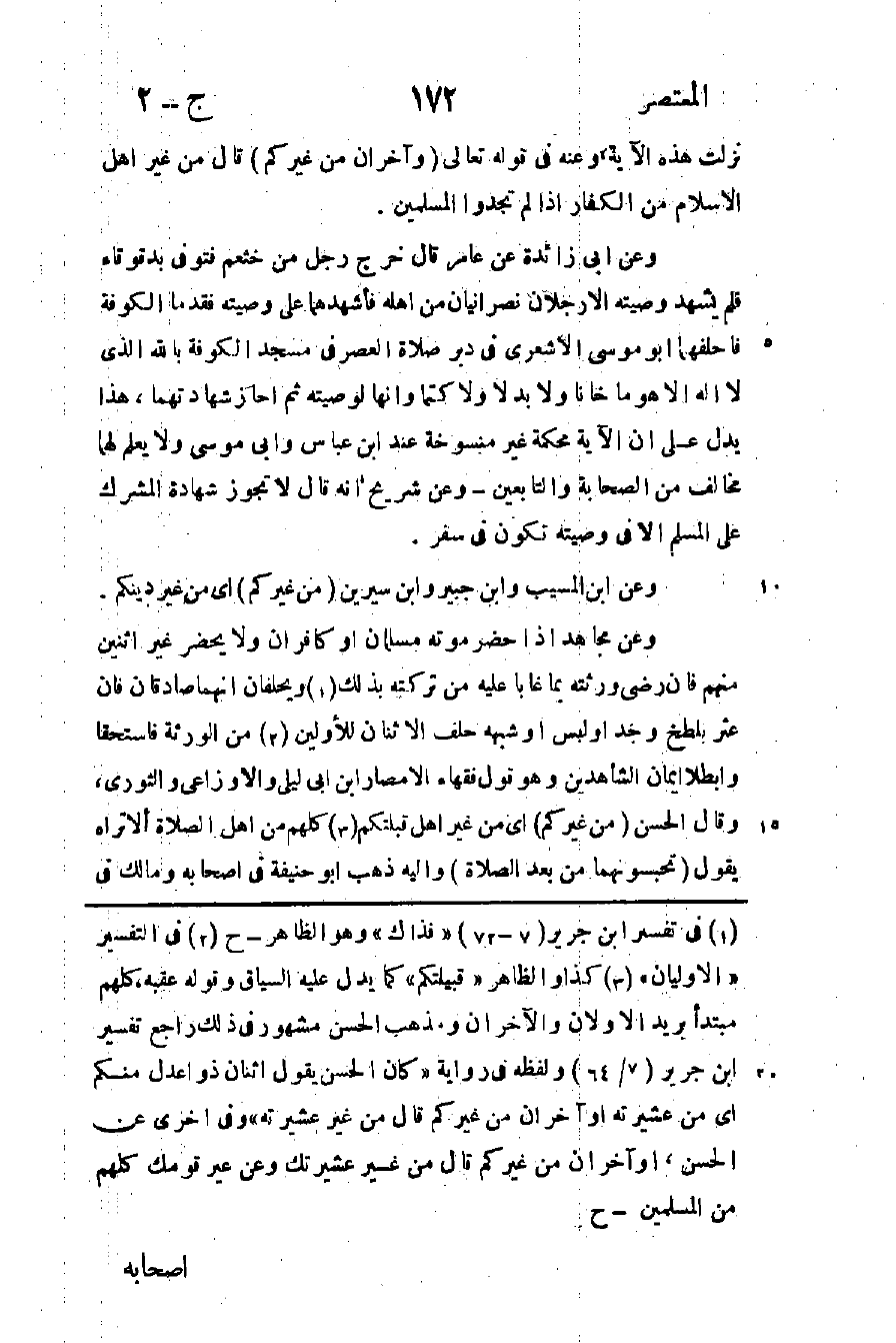 وعن أبي زائدة عن عامر قال: خرج رجل من خثعم فتوفي بدقوقاء فلم يشهد وصيته إلا رجلان نصرانيان من أهله فأشهدهما على وصيته فقدما الكوفة فاحلفهما أبو موسى الأشعري في دبر صلاة العصر في مسجد الكوفة بالله الذي لا إله إلا هو ما خانا ولابد ولا كتما وإنها لوصيته ثم أحاز شهادتهما هذا يدل على أن الآية محكمة غير منسوخة عند ابن عباس وأبي موسى ولا يعلم لهما مخالف من الصحابة والتابعين وعن شريح أنه قال: لا تجوز شهادة المشرك على المسلم إلا في وصيته تكون في سفر.