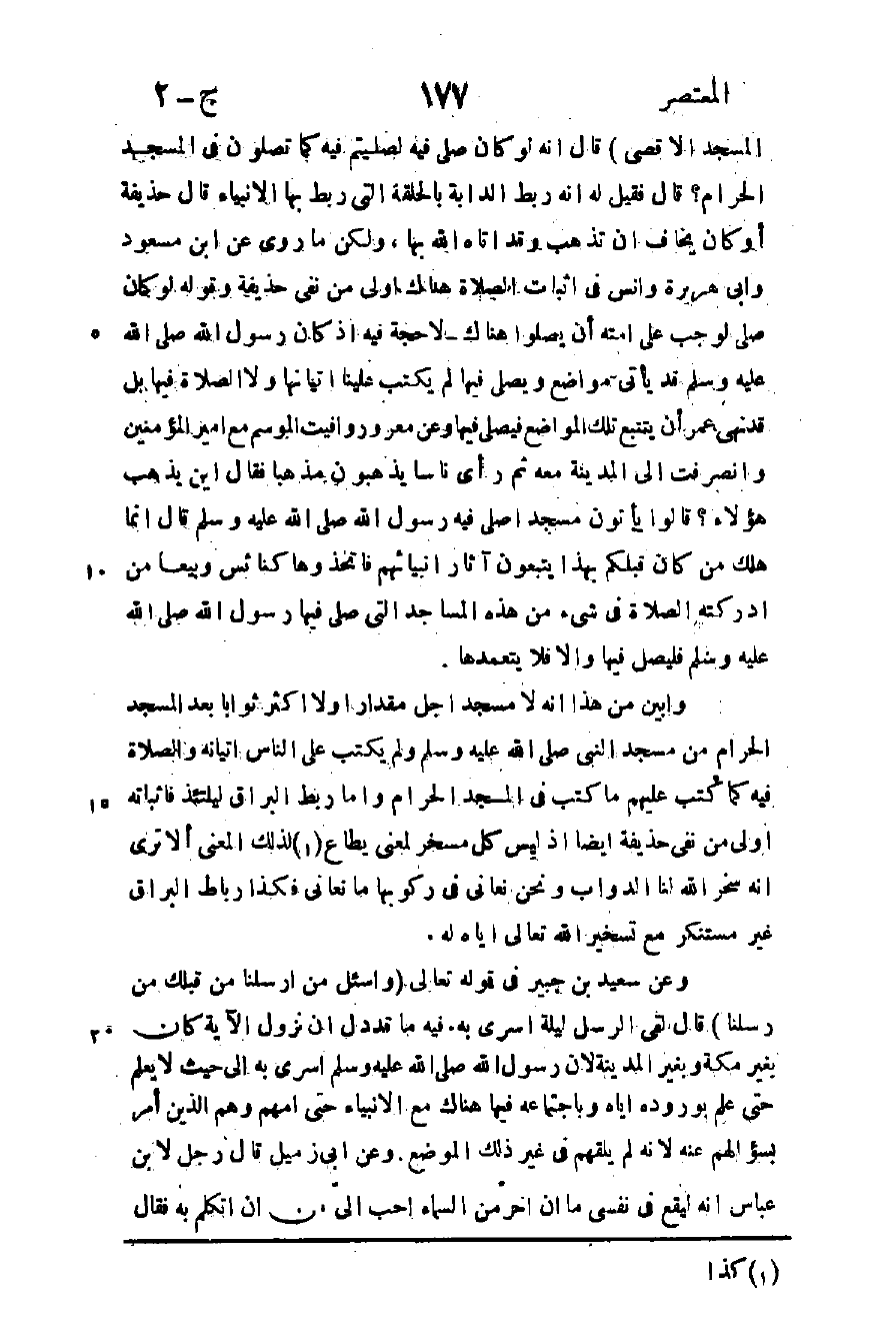الْمَسْجِدِ الْأَقْصَى} قال: أنه لو كان صلى فيه لصليتم فيه كما تصلون في المسجد الحرام قال: فقيل له: أنه ربط الدابة بالحلقة التي ربط بها الأنبياء قال حذيفة: أو كان يخاف أن تذهب وقد أتاه الله بها ولكن ما روي عن ابن مسعود وأبي هريرة وأنس في إثبات الصلاة هناك أولى من نفي حذيفة وقوله: لو كان صلى لوجب على أمته أن يصلوا هناك لا حجة فيه إذ كان رسول الله صلى الله عليه وسلم قد يأتي مواضع ويصلي فيها لم يكتب علينا إتيانها ولا الصلاة فيها بل قد نهى عمر أن يتتبع تلك المواضع فيصلي فيها وعن معرور وافيت الموسم مع أمير المؤمنين وانصرفت إلى المدينة معه ثم رأى ناسا يذهبون مذهبا فقال: أين يذهب هؤلاء؟ قالوا: يأتون مسجد أصلي فيه رسول الله صلى الله عليه وسلم قال: إنما هلك من كان قبلكم بهذا يتبعون آثار أنبيائهم فاتخذوها كنائس وبيعا من أدركته الصلاة في شيء من هذه المساجد التي صلى فيها رسول الله صلى الله عليه وسلم فليصل فيها وإلا فلا يتعمدها.