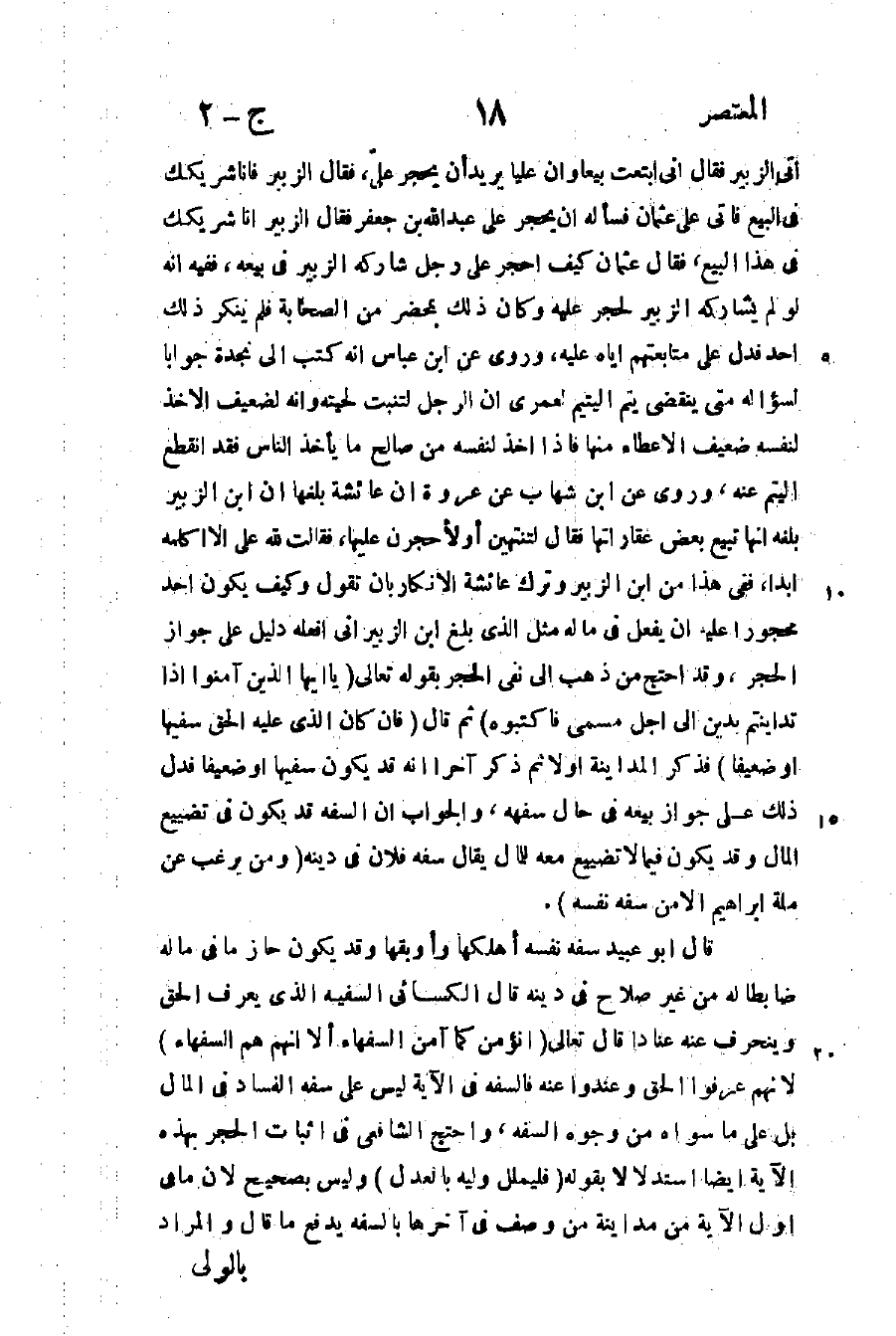 أتى الزبير فقال: أني ابتعت بيعا وإن عليا يريد أن يحجر علي فقال الزبير: فأنا شريكك في البيع فأتى على عثمان فسأله أن يحجر على عبد الله بن جعفر فقال الزبير: أنا شريكك في هذا البيع فقال عثمان: كيف أحجر على رجل شاركه الزبير في بيعه ففيه أنه لو لم يشاركه الزبير لحجر عليه وكان ذلك بمحضر من الصحابة فلم ينكر ذلك أحد فدل على متابعتهم إياه عليه وروى عن ابن عباس أنه كتب إلى نجدة جوابا لسؤاله متى ينقضي يتم اليتيم لعمري أن الرجل لتنبت لحيته وأنه لضعيف الأخذ لنفسه ضعيف الإعطاء منها فإذا أخذ لنفسه من صالح ما يأخذ الناس فقد انقطع اليتم عنه وروى عن ابن شهاب عن عروة أن عائشة بلغها أن ابن الزبير بلغه أنها تبيع بعض عقاراتها فقال: لتنتهين أو لأحجرن عليها فقالت لله على ألا أكلمه أبدا ففي هذا من ابن الزبير وترك عائشة الإنكار بأن تقول وكيف يكون أحد محجورا عليه أن يفعل في ما له مثل الذي بلغ ابن الزبير أني أفعله دليل على جواز الحجر وقد احتج من ذهب إلى نفي الحجر بقوله تعالى: {يَا أَيُّهَا الَّذِينَ آمَنُوا إِذَا تَدَايَنْتُمْ بِدَيْنٍ إِلَى أَجَلٍ مُسَمّىً فَاكْتُبُوهُ} ثم قال: {فَإِنْ كَانَ الَّذِي عَلَيْهِ الْحَقُّ سَفِيهاً أَوْ ضَعِيفاً} فذكر المداينة أولا ثم ذكر آخرا أنه قد يكون سفيها أو ضعيفا فدل ذلك على جواز بيعه في حال سفهه والجواب أن السفه قد يكون في تضييع المال وقد يكون فيما لا تضييع معه للمال يقال: سفه فلان في دينه {وَمَنْ يَرْغَبُ عَنْ مِلَّةِ إِبْرَاهِيمَ إِلَّا مَنْ سَفِهَ نَفْسَهُ} قال أبو عبيد: سفه نفسه أهلكها وأوبقها وقد يكون حاز ما في ماله ضابطا له من غير صلاح في دينه قال الكسائي: السفيه الذي يعرف الحق وينحرف عنه عنادا قال تعالى: {أَنُؤْمِنُ كَمَا آمَنَ السُّفَهَاءُ أَلا إِنَّهُمْ هُمُ السُّفَهَاءُ} لأنهم عرفوا الحق وعندوا عنه فالسفه في الآية ليس على سفه الفساد في المال بل على ما سواه من وجوه السفه واحتج الشافعي في إثبات الحجر بهذه الآية أيضا استدلالا بقوله: {فَلْيُمْلِلْ وَلِيُّهُ بِالْعَدْلِ} وليس بصحيح لأن ما في أول الآية من مداينة من وصف في آخرها بالسفه يدفع ما قال والمراد