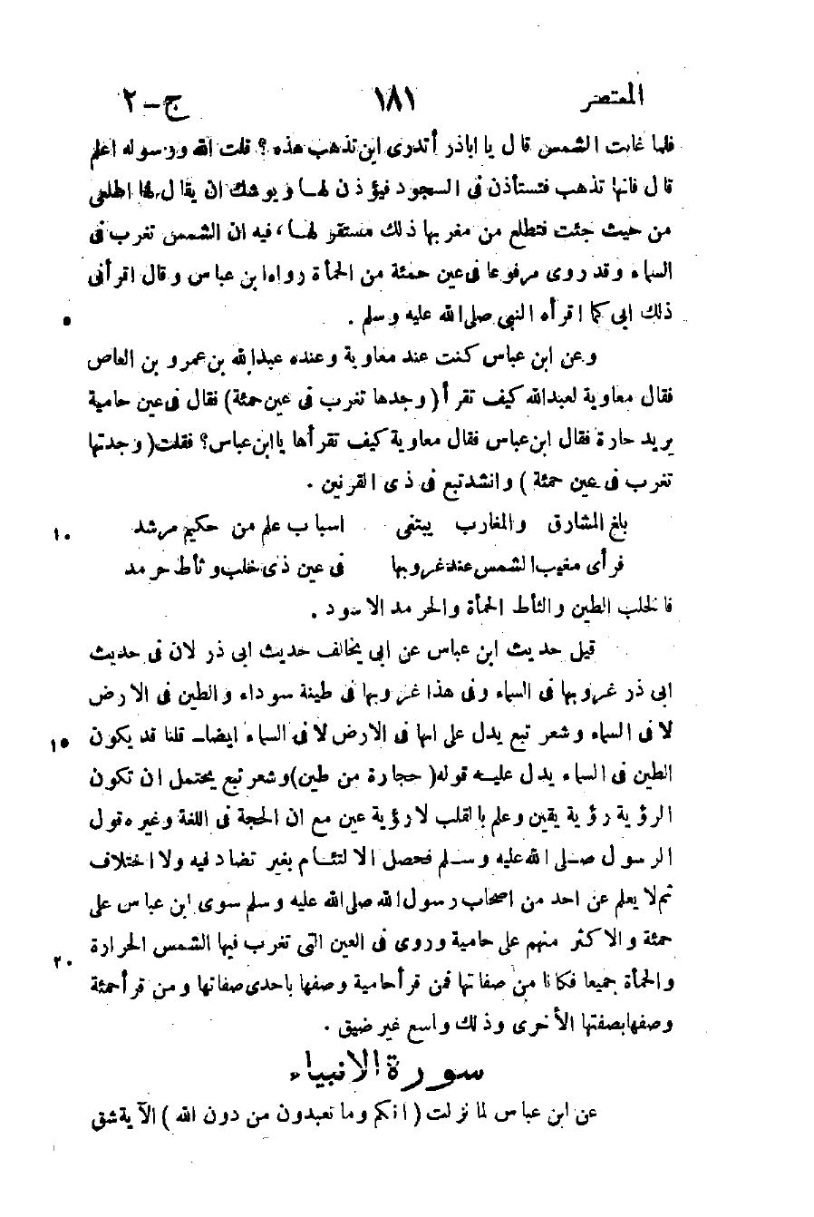 وعن ابن عباس كنت عند معاوية وعنده عبد الله بن عمرو بن العاص فقال معاوية لعبد الله: كيف تقرأ {وَجَدَهَا تَغْرُبُ فِي عَيْنٍ حَمِئَةٍ} فقال: في عين حامية يريد حارة فقال ابن عباس: فقال معاوية كيف تقرأها يا ابن عباس؟ فقلت: {وَجَدَهَا تَغْرُبُ فِي عَيْنٍ حَمِئَةٍ} وأنشد تبع في ذي القرنين.