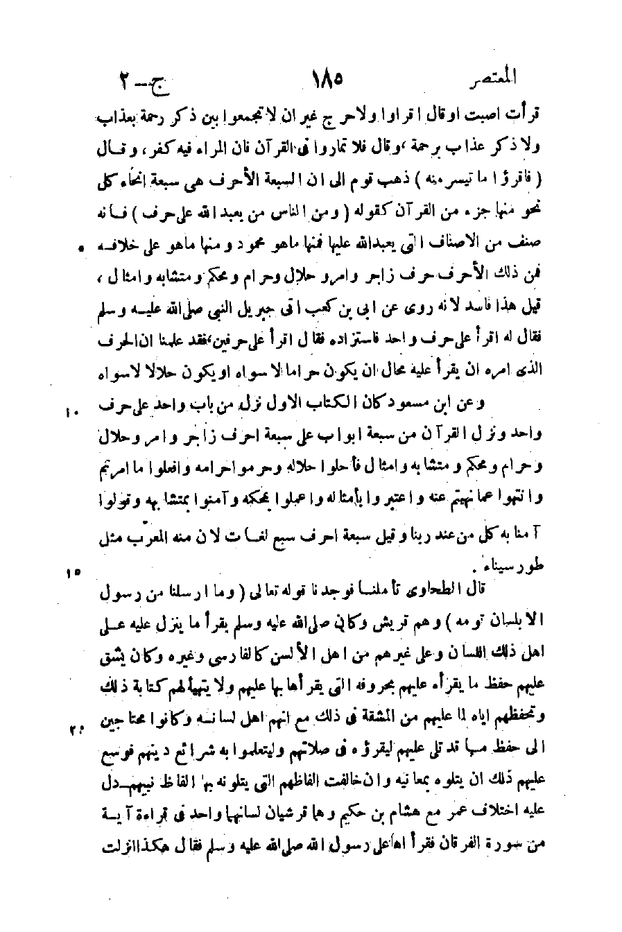 قال الطحاوي: تأملنا فوجدنا قوله تعالى: {وَمَا أَرْسَلْنَا مِنْ رَسُولٍ إِلَّا بِلِسَانِ قَوْمِهِ} وهم قريش وكان صلى الله عليه وسلم يقرأ: ما ينزل عليه على أهل ذلك اللسان وعلى غيرهم من أهل الألسن كالفارسي وغيره وكان يشق عليهم حفظ ما يقرأه عليهم بحروفه التي يقرأها بها عليهم ولا يتهيأ لهم كتابة ذلك وتحفظهم إياه لما عليهم من المشقة في ذلك مع أنهم أهل لسانه وكانوا محتاجين إلى حفظ ما قد تلى عليهم ليقرؤه في صلاتهم وليتعلموا به شرائع دينهم فوسع عليهم ذلك أن يتلوه بمعانيه وإن خالفت ألفاظهم التي يتلونه بها ألفاظ نبيهم دل عليه اختلاف عمر مع هشام بن حكيم وهما قرشيان لسانهما واحد في قراءة آية من سورة الفرقان فقرأها على رسول الله صلى الله عليه وسلم فقال: "هكذا أنزلت