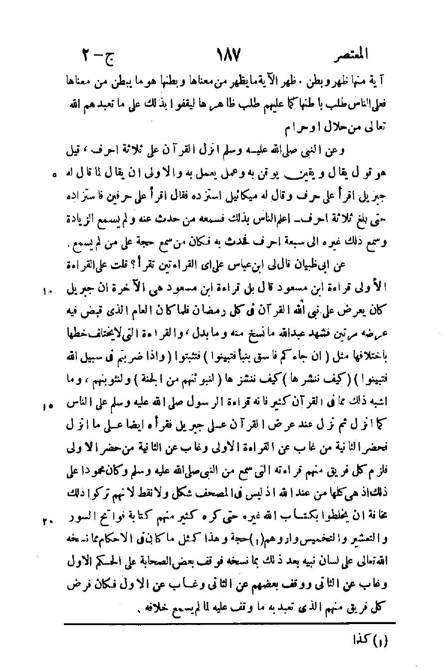 عن أبي ظبيان قال لي ابن عباس: على أي القراءتين تقرأ؟ قلت: على القراءة الأولى قراءة ابن مسعود قال: بل قراءة ابن مسعود هي الآخرة أن جبريل كان يعرض على نبي الله القرآن في كل رمضان فلما كان العام الذي قبض فيه عرضه مرتين فشهد عبد الله ما نسخ منه وما بدل والقراءة التي لا يختلف خطها باختلافها مثل: {إِنْ جَاءَكُمْ فَاسِقٌ بِنَبَأٍ فَتَبَيَّنُوا} فتثبتوا {إِذَا ضَرَبْتُمْ فِي سَبِيلِ اللَّهِ فَتَبَيَّنُوا} {كَيْفَ نُنْشِزُهَا} {لَنُبَوِّئَنَّهُمْ مِنَ الْجَنَّةِ} ولنثوبنهم وما أشبه ذلك مما في القرآن كثير فإنه قراءة الرسول صلى الله عليه وسلم على الناس كما أنزل ثم نزل عند عرض القرآن على جبريل فقرأه أيضا على ما أنزل فحضر الثانية من غاب عن القراءة الأولى وغاب عن الثانية من حضر الأولى فلزم كل فريق منهم قراءته التي سمع من النبي صلى الله عليه وسلم وكان محمودا على ذلك إذ هي كلها من عند الله إذ ليس في المصحف شكل ولا نقط لأنهم تركوا ذلك مخافة أن يخلطوا بكتاب الله غيره حتى كره كثير منهم كتابة فواتح السور والتعشير والتخميس واروهم1 حجة وهذا كمثل ما كان في الأحكام مما نسخه الله تعالى على لسان نبيه بعد ذلك بما نسخه فوقف بعض الصحابة على الحكم الأول وغاب عن الثاني ووقف بعضهم عن الثاني وغاب عن الأول فكان فرض كل فريق منهم الذي تعبد به ما وقف عليه لما لم يسمع خلافه.