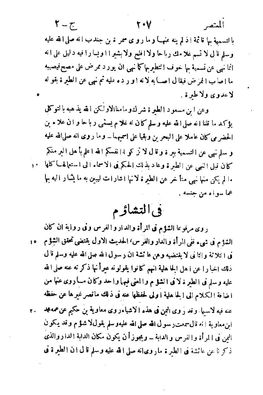 روي مرفوعا "الشؤم في المرأة والدار والفرس" وفي رواية "إن كان الشؤم في شيء ففي المرأة والدار والفرس" الحديث الأول يقتضي تحقق الشؤم في الثلاثة والثاني لا يقتضيه وعن عائشة أن رسول الله صلى الله عليه وسلم قال ذلك إخبارا عن أهل الجاهلية أنهم كانوا يقولونه غير أنها ذكرته عنه صلى الله عليه وسلم في الطيرة لا في الشؤم والمعنى فيهما واحد وكان ما روي عنها في إضافة الكلام إلى الجاهلية أولى لحفظها عنه في ذلك ما قصر غيرها عن حفظه عنه فيه لا سيما وقد روي اليمن في هذه الأشياء روي معاوية بن حكيم عن عمه محمد بن معاوية أنه قال: سمعت رسول الله صلى الله عليه وسلم يقول: "لا شؤم وقد يكون اليمن في المرأة والفرس والدابة" ويجوز أن يكون مكان الدابة الدار والذي ذكرنا عن عائشة في الطيرة ما روي أنه صلى الله عليه وسلم قال: "إن الطيرة في