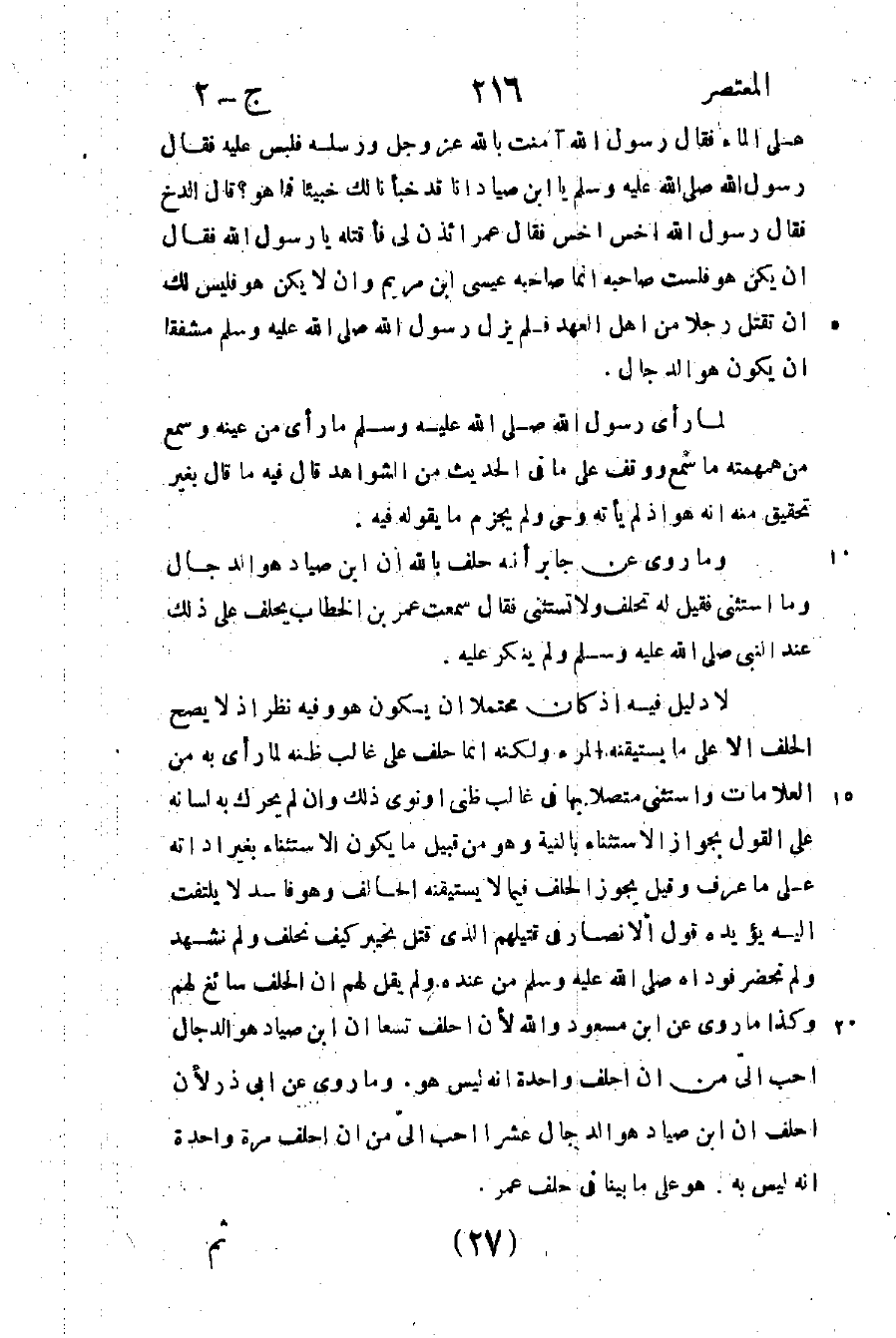 لا دليل فيه إذ كان محتملا أن يكون هو وفيه نظر إذ لا يصح الحلف إلا على ما يستيقنه المرء ولكنه إنما حلف على غالب ظنه لما رأى به من العلامات واستثنى متصلا بها في غالب ظني أو نوى ذلك وإن لم يحرك به لسانه على القول بجواز الإستثناء بالنية وهو من قبيل ما يكون الاستثناء بغير أداته على ما عرف وقيل يجوز الحلف فيما لا يستيقنه الحالف وهو فاسد لا يلتفت إليه يؤيده قول الأنصار في قتيلهم الذي قتل بخيبر كيف نحلف ولم نشهد ولم نحضر فوداه صلى الله عليه وسلم من عنده ولم يقل لهم أن الحلف سائغ لهم وكذا ما روى عن ابن مسعود والله لأن أحلف تسعا أن ابن صياد هو الدجال أحب إلي من أن أحلف واحدة أنه ليس هو وما روي عن أبي ذر لأن أحلف أن ابن صياد هو الدجال عشرا أحب إلي من أن أحلف مرة واحدة أنه ليس به هو على ما بينا في حلف عمر.
