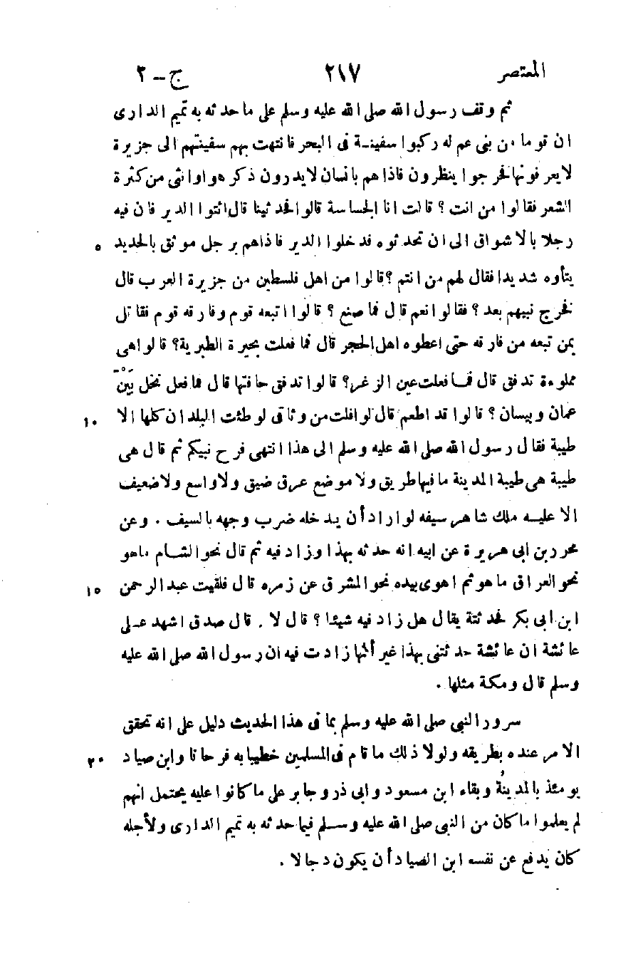 ثم وقف رسول الله صلى الله عليه وسلم على ما حدثه به تميم الداري أن قوما من بني عم له ركبوا سفينة في البحر فانتهت بهم سفينتهم إلى جزيرة لا يعرفونها فخرجوا ينظرون فإذا هم بإنسان لا يدرون ذكر هو أو أنثى من كثرة الشعر فقالوا: من أنت؟ قالت: أنا الجساسة قالوا: فحدثينا قال: أئتوا الدير فإن فيه رجلا بالأشواق إلى أن تحدثوه فدخلوا الدير فإذا هم برجل موثق بالحديد يتأوه شديدا فقال لهم: من أنتم؟ قالوا: من أهل فلسطين من جزيرة العرب قال: فخرج نبيهم بعد؟ فقالوا: نعم قال: فما صنع؟ قالوا: اتبعه قوم وفارقه قوم فقاتل بمن تبعه من فارقه حتى أعطوه أهل الحجر قال: فما فعلت بحيرة الطبرية؟ قالوا: هي مملوءة تدفق قال: فما فعلت عين الزغر؟ قالوا: تدفق حافتها قال: فما فعل نخل بين عمان وبيسان؟ قالوا: قد أطعم قال: لو أفلت من وثاقي لوطئت البلدان كلها إلا طيبة فقال رسول الله صلى الله عليه وسلم: "إلى هذا انتهى فرح نبيكم" ثم قال: "هي طيبة هي طيبة المدينة ما فيها طريق ولا موضع عرق ضيق ولا واسع ولا ضعيف إلا عليه ملك شاهر سيفه لو أراد أن يدخله ضرب وجهه بالسيف". وعن محرر بن أبي هريرة عن أبيه أنه حدثه بهذا وزاد فيه ثم قال: نحو الشام ما هو نحو العراق ما هو ثم أهوى بيده نحو المشرق عن زمره قال: فلقيت عبد الرحمن ابن أبي بكر فحدثته يقال: هل زاد فيه شيئا؟ قال: لا قال: صدق أشهد على عائشة أن عائشة حدثتني بهذا غير أنها زادت فيه أن رسول الله صلى الله عليه وسلم قال: "ومكة مثلها".