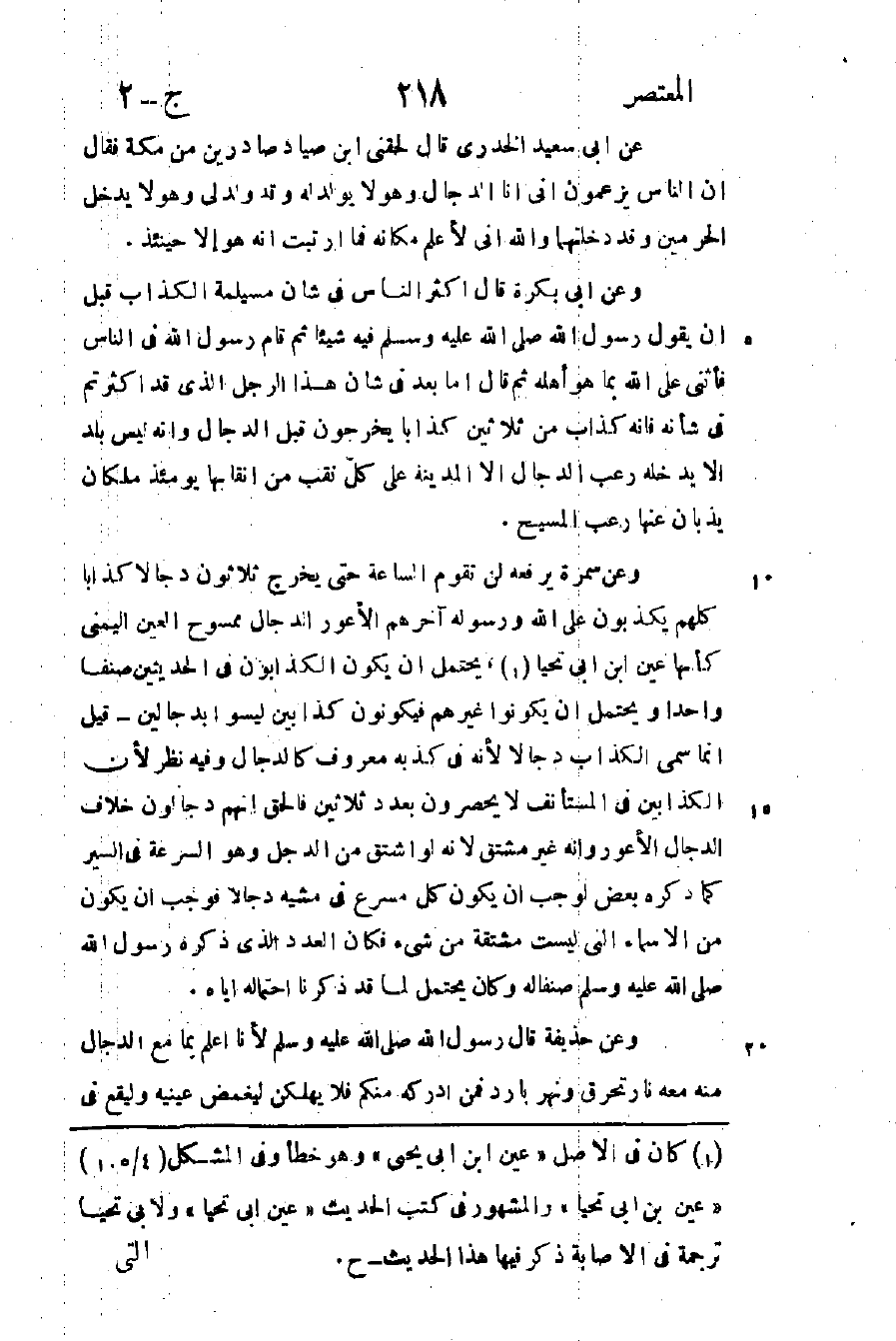 وعن سمرة يرفعه: "لن تقوم الساعة حتى يخرج ثلاثون دجالا كذابا كلهم يكذبون على الله ورسوله آخرهم الأعور الدجال ممسوح العين اليمنى كأنها عين ابن أبي تحيا1" يحتمل أن يكون الكذابون في الحديثين صنفا واحدا ويحتمل أن يكونوا غيرهم فيكونون كذابين ليسوا بدجالين قبل أنما سمى الكذاب دجالا لأنه في كذبه معروف كالدجال وفيه نظر لأن الكذابين في المستأنف لا يحصرون بعدد ثلاثين فالحق أنهم دجالون خلاف الدجال الأعور وأنه غير مشتق لأنه لو اشتق من الدجل وهو السرعة في السير كما ذكره بعض لوجب أن يكون كل مسرع في مشيه دجالا فوجب أن يكون من الأسماء التي ليست مشتقة من شيء فكان العدد الذي ذكره رسول الله صلى الله عليه وسلم صنفا له وكان يحتمل لما قد ذكرنا احتماله إياه.