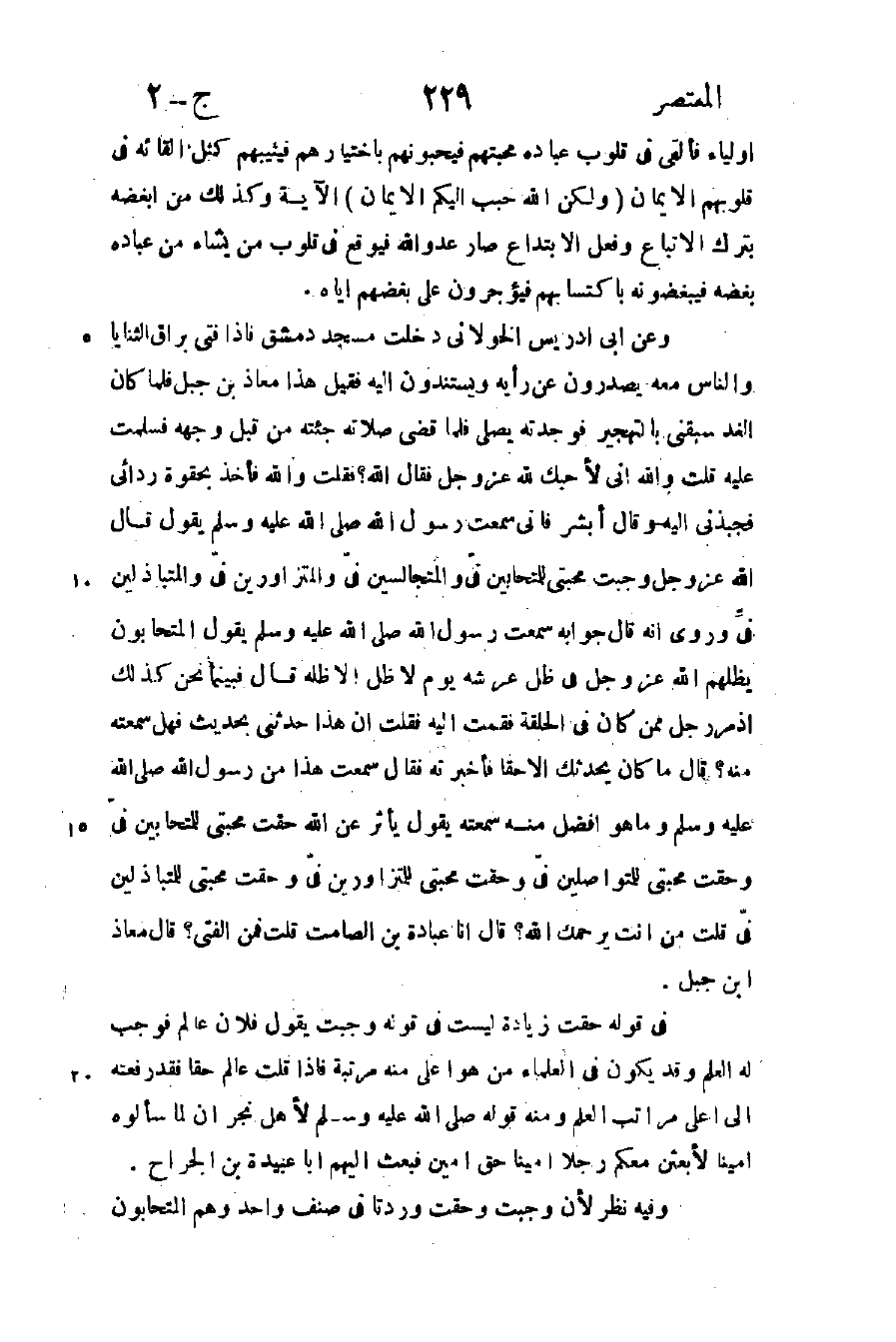 وعن أبي إدريس الخولاني دخلت مسجد دمشق فإذا فتى براق الثنايا والناس معه يصدرون عن رأيه ويستندون إليه فقيل: هذا معاذ بن جبل فلما كان الغد سبقني بالتهجير فوجدته يصلي فلما قضى صلاته جئته من قبل وجهه فسلمت عليه قلت: والله إني لأحبك لله عز وجل فقال: الله؟ فقلت: والله فأخذ بحقوة ردائي فجبذني إليه وقال: أبشر فإني سمعت رسول الله صلى الله عليه وسلم يقول: "قال الله عز وجل وجبت محبتي للمتحابين في والمتجالسين في والمتزاورين في والمتباذلين في" , وروى أنه قال: جوابه سمعت رسول الله صلى الله عليه وسلم يقول: "المتحابون يظلهم الله عز وجل في ظل عرشه يوم لا ظل إلا ظله" قال: فبينما نحن كذلك إذ مر رجل ممن كان في الحلقة فقمت إليه فقلت: أن هذا حدثني بحديث فهل سمعته منه؟ قال: ما كان يحدثك إلا حقا فأخبرته فقال: سمعت هذا من رسول الله صلى الله عليه وسلم وما هو أفضل منه سمعته يقول يأثر عن الله: "حقت محبتي للمتحابين في وحقت محبتي للمتواصلين في وحقت محبتي للمتزاورين في وحقت محبتي للمتباذلين في" قلت: من أنت يرحمك الله؟ قال: أنا عبادة بن الصامت قلت: فمن الفتى؟ قال: معاذ بن جبل.