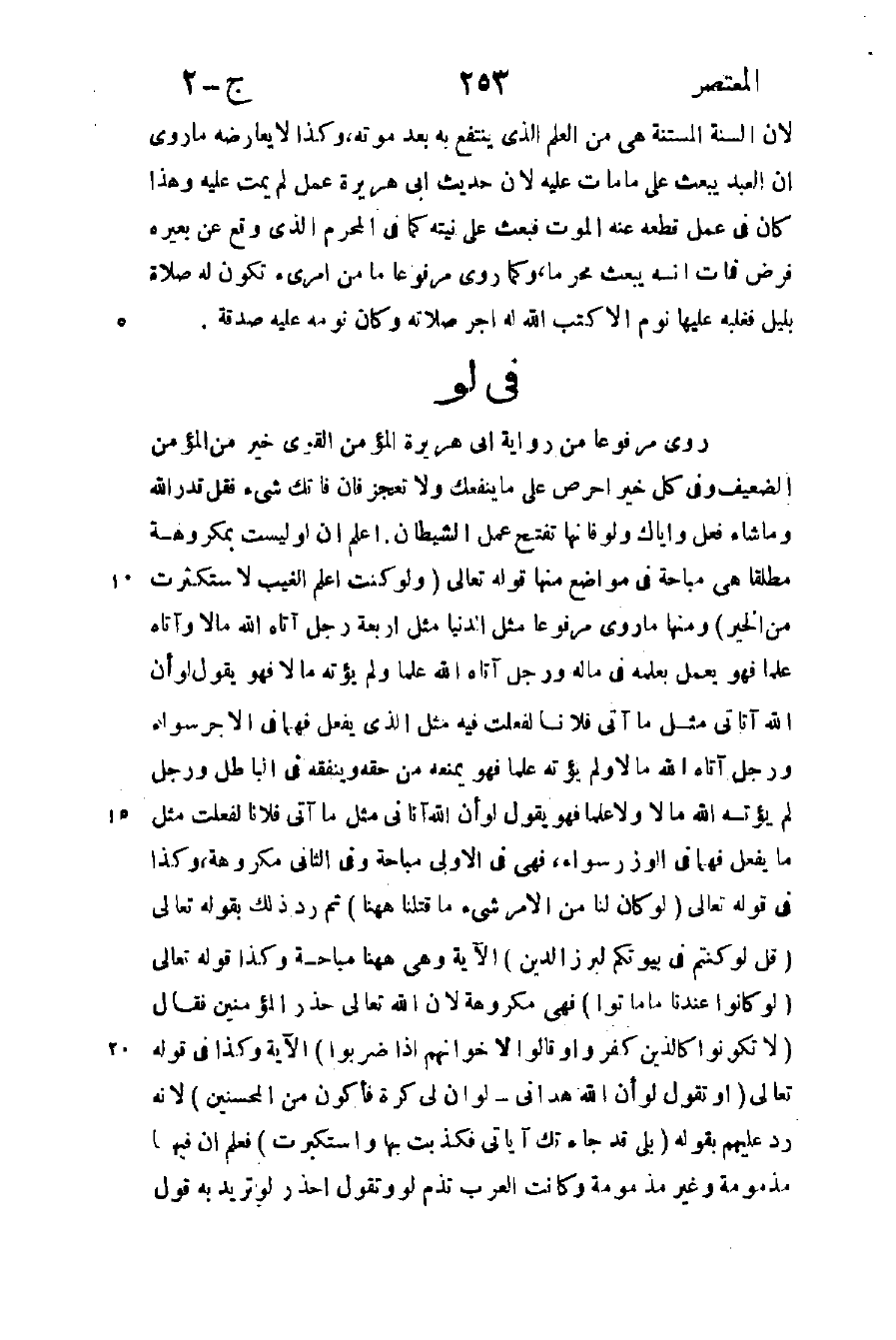 روي مرفوعا من رواية أبي هريرة: "المؤمن القوي خير من المؤمن الضعيف وفي كل خير أحرص على ما ينفعك ولا تعجز فإن فاتك شيء فقل قدر الله وماشاء فعل وإياك ولو فإنها تفتح عمل الشيطان" أعلم أن لو ليست بمكروهة مطلقا هي مباحة في مواضع منها قوله تعالى: {وَلَوْ كُنْتُ أَعْلَمُ الْغَيْبَ لَاسْتَكْثَرْتُ مِنَ الْخَيْرِ} ومنها: ما روى مرفوعا: "مثل الدنيا مثل أربعة رجل آتاه الله مالا وآتاه علما فهو يعمل بعلمه في ماله ورجل آتاه الله علما ولم يؤته مالا فهو يقول: لو أن الله آتاني مثل ما آتى فلانا لفعلت فيه مثل الذي يفعل فهما في الأجر سواء ورجل آتاه الله مالا ولم يؤته علما فهو يمنعه من حقه وينفقه في الباطل ورجل لم يؤته الله مالا ولا علما فهو يقول: لو أن الله أتاني مثل ما آتى فلانا لفعلت مثل ما يفعل" فهما في الوزر سواء فهي في الأولى مباحة وفي الثاني مكروهة وكذا في قوله تعالى: {لَوْ كَانَ لَنَا مِنَ الْأَمْرِ شَيْءٌ مَا قُتِلْنَا هَاهُنَا} ثم رد ذلك بقوله تعالى: {قُلْ لَوْ كُنْتُمْ فِي بُيُوتِكُمْ لَبَرَزَ الَّذِينَ} الآية وهي ههنا مباحة وكذا قوله تعالى: {لَوْ كَانُوا عِنْدَنَا مَا مَاتُوا} فهي مكروهة لأن الله تعالى حذر المؤمنين فقال: {لا تَكُونُوا كَالَّذِينَ كَفَرُوا وَقَالُوا لإِخْوَانِهِمْ إِذَا ضَرَبُوا} الآية وكذا في قوله تعالى: {أَوْ تَقُولَ لَوْ أَنَّ اللَّهَ هَدَانِي لَكُنْتُ مِنَ الْمُتَّقِينَ أَوْ تَقُولَ حِينَ تَرَى الْعَذَابَ لَوْ أَنَّ لِي كَرَّةً فَأَكُونَ مِنَ الْمُحْسِنِينَ} لأنه رد عليهم بقوله: {بَلَى قَدْ جَاءَتْكَ آيَاتِي فَكَذَّبْتَ بِهَا وَاسْتَكْبَرْتَ} فعلم أن فيها مذمومة وغير مذمومة وكانت العرب تذم لو وتقول احذر لو تريد به قول