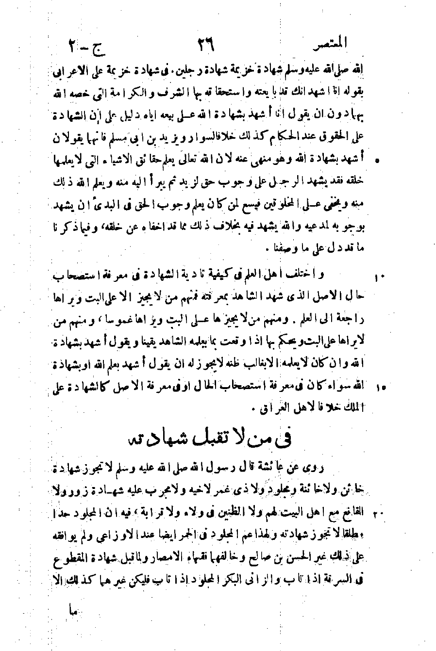 الله صلى الله عليه وسلم شهادة خزيمة شهادة رجلين في شهادة خزيمة على الأعرابي بقوله: أنا أشهد أنك قد بايعته واستحقاقه بها الشرف والكرامة التي خصه الله بهما دون أن يقول أن أشهد بشهادة الله على بيعه إياه دليل على أن الشهادة على الحقوق عند الحكام كذلك خلافا لسوار ويزيد بن أبي مسلم فإنهما يقولان: أشهد بشهادة الله وهو منهى عنه لأن الله تعالى يعلم حقائق الأشياء التي لا يعلمها خلقه فقد يشهد الرجل على وجوب حق لزيد ثم ببرأ إليه منه ويعلم الله ذلك منه ويخفى على المخلوقين فيسع لمن كان يعلم وجوب الحق في البدئ أن يشهد بوجوبه المدعيه والله يشهد فيه بخلاف ذلك مما قد أخفاه عن خلقه وفيما ذكرنا ما قد دل على ما وصفنا.