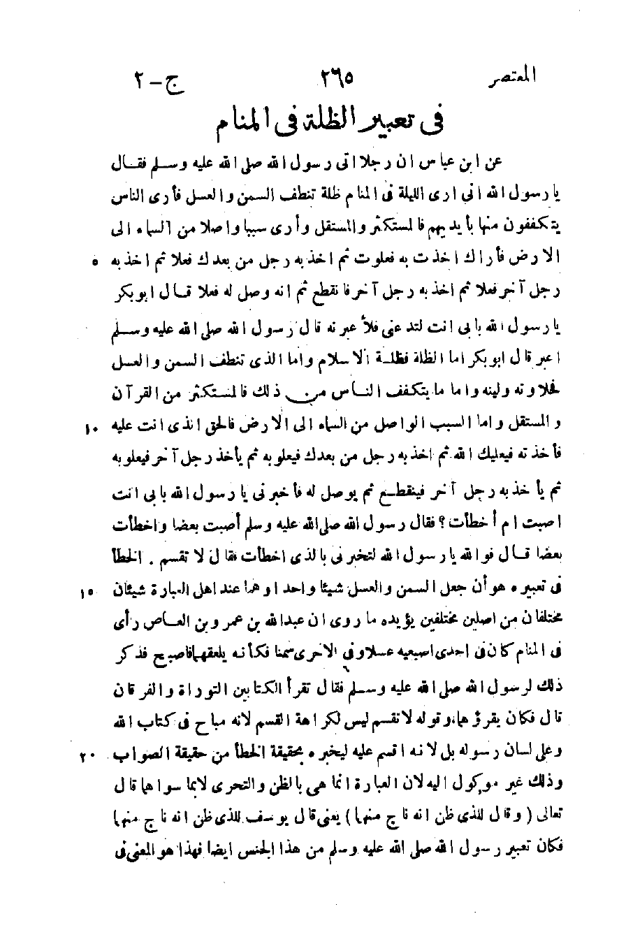 عن ابن عباس أن رجلا أتى رسول الله صلى الله عليه وسلم فقال: يا رسول الله إني أرى الليلة في المنام ظلة تنطف السمن والعسل فأرى الناس يتكففون منها بأيديهم فالمستكثر والمستقل وأرى سببا واصلا من السماء إلى الأرض فأراك أخذت به فعلوت ثم أخذ به رجل من بعدك فعلا ثم أخذ به رجل آخر فعلا ثم أخذ به رجل آخر فانقطع ثم أنه وصل له فعلا قال أبو بكر: يا رسول الله بأبي أنت لتدعني فلأعبرنه قال رسول الله صلى الله عليه وسلم: "أعبر" قال أبوبكر: أما الظلة فظلة الإسلام وأما الذي تنطف السمن والعسل فحلاوته ولينه وأما ما يكتكفف الناس من ذلك فالمستكثر من القرآن والمستقل وأما السبب الواصل من السماء إلى الأرض فالحق الذي أنت عليه فأخذته فيعليك الله ثم أخذ به رجل من بعدك فيعلو به ثم يأخذ رجل آخر فيعلو به ثم يأخذ به رجل آخر فينقطع ثم يوصل له فأخبرني يا رسول الله بأبي أنت أصبت أم أخطأت؟ فقال رسول الله صلى الله عليه وسلم: "أصبت بعضا وأخطأت بعضا" قال: فوالله يا رسول الله لتخبرني بالذي أخطأت فقال: "لا تقسم". الخطأ في تعبيره هو أن جعل السمن والعسل شيئا واحدا وهما عند أهل العبارة شيئان مختلفان من أصلين مختلفين يؤيده ما روي أن عبد الله بن عمرو بن العاص رأى في المنام كان في إحدى أصبعيه عسلا وفي الأخرى سمنا فكأنه يلعقهما فأصبح فذكر ذلك لرسول الله صلى الله عليه وسلم فقال: "تقرأ الكتابين التوراة والفرقان" قال: فكان يقرؤهما وقوله: "لا تقسم" ليس لكراهة القسم لأنه مباح في كتاب الله وعلى لسان رسوله بل لأنه أقسم عليه وليخبره بحقيقة الخطأ من حقيقة الصواب وذلك غير موكول إليه لأن العبارة إنما هي بالظن والتحري لا بما سواهما قال تعالى: {وَقَالَ لِلَّذِي ظَنَّ أَنَّهُ نَاجٍ مِنْهُمَا} يعني: قال يوسف للذي ظن أنه ناج منهما فكان تعبير رسول الله صلى الله عليه وسلم من هذا الجنس أيضا فهذا هو المعنى في