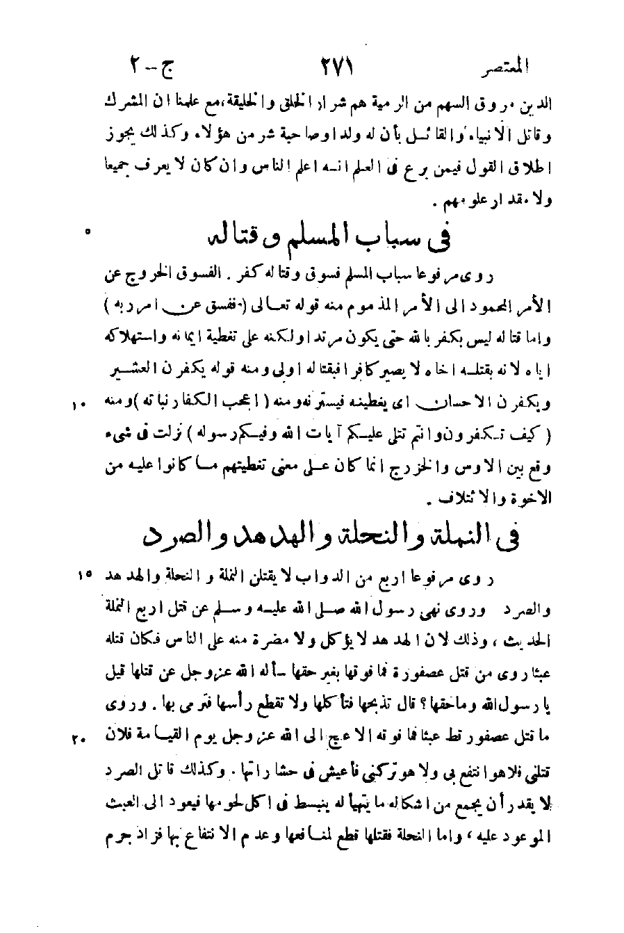 روى مرفوعا "أربع من الدواب لا يقتلن النملة والنحلة والهدهد والصرد" وروى نهي رسول الله صلى الله عليه وسلم عن قتل أربع النملة الحديث، وذلك لأن الهدهد لا يؤكل ولا مضرة منه على الناس فكان قتله عبثا، روى من قتل عصفورة فما فوقها بغير حقها سأله الله عز وجل عن قتلها قيل: يا رسول الله وما حقها؟ قال: "تذبحها فتأكلها ولا تقطع رأسها فترمي بها"، وروي ما قتل عصفور قط عبثا فما فوقه إلا عج إلى الله عز وجل يوم القيامة فلان قتلني فلا هو انتفع بي ولا هو تركني فأعيش في حشاراتها. وكذلك قاتل الصرد لا يقدر أن يجمع من أشكاله ما يتهيأ له ينبسط في أكل لحومها فيعود إلى العبث الموعود عليه وأما النحلة فقتلها قطع لمنافعها وعدم الانتفاع بها فزاد جرم